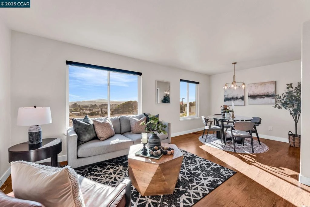Breathtaking views of the Bay, Mt. Tam, SF skyline & Bay Bridge from this elegantly updated 3BD/2.5BA Mediterranean retreat on a peaceful cul-de-sac. Light-filled main level features a designer kitchen w/ stainless appliances, open-concept living/dining w/ fireplace, and French doors to a private patio-perfect for al fresco entertaining! Luxe primary suite upstairs with sweeping views, bath & dressing area. Recent high-end upgrades include new garage doors & system, custom carpet, paint, lighting, gutters, fencing, landscaping & more showcasing thoughtful investment and refined style. Dual-pane windows, sleek flooring, artistic finishes & low-maintenance native garden. Oversized 2-car garage , wide driveway & ample parking. Exceptional location near parks, local gems, BART, Richmond ferry, freeway access, & public transportation. Fast internet, beautiful weather & great neighbors complete this exceptional move-in-ready home! This home qualifies for a limited-time lender-paid 2-1 buydown— reduced monthly payments for the first 2 years at no cost to the buyer or seller. Ask listing agent for details!