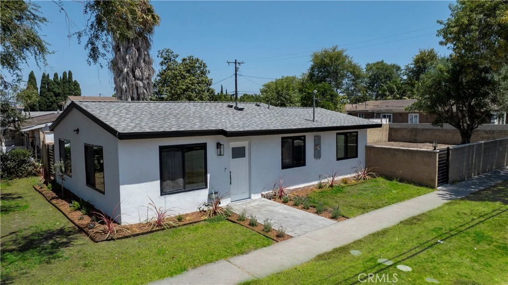 Discover this turnkey Santa Ana gem within blocks from historic Main Street in old town Santa Ana, with close access to the 55 and 405, John Wayne and South Coast Plaza — a fully remodeled home with permits offering high-end finishes, modern systems, and an expansive private lot. Situated on a huge corner lot in the heart of Orange County, this property is perfect for first-time buyers or investors looking to expand with large back yard with room to build ADU or home addition. Everything is NEW and has been thoughtfully done: brand-new roof, new waterproof thick luxury vinyl wood floors, and vaulted ceilings with R-30 insulation. Enjoy new drywall and paint, new exterior stucco, all-new windows and doors (including a privacy WiFi-controlled exterior door), and walk-in closets. The chef’s kitchen boasts premium wood cabinets with soft-close doors and drawers, quartz countertops with matching backsplash, and stunning white-and-gold appliances — refrigerator, range, hood, dishwasher, and washer/dryer tower. Major systems are fully modernized with a WiFi-controlled ductless mini-split (3 zones), new tankless water heater, new plumbing re-pipe throughout, new 200-amp electrical panel, new wiring, outlets, switches, and ceiling lights, plus an EV charger outlet in the yard. Tech features include wired Ethernet for exterior POE security cameras, a WiFi doorbell, and AT&T fiber internet availability. Outside, enjoy mature trees, a new concrete patio, front porch pavers, and complete privacy with brick walls and new steel gates. There’s secure inside-gate parking for a boat, RV, or business equipment. The spacious lot is ADU-ready and offers room to expand the home for additional income potential. With all work completed with permits, this property is a rare blend of style, function, and investment opportunity. Buyers can possibly qualify for $10k down payment assistance program with Wells Fargo for the mortgage, call for more information.
