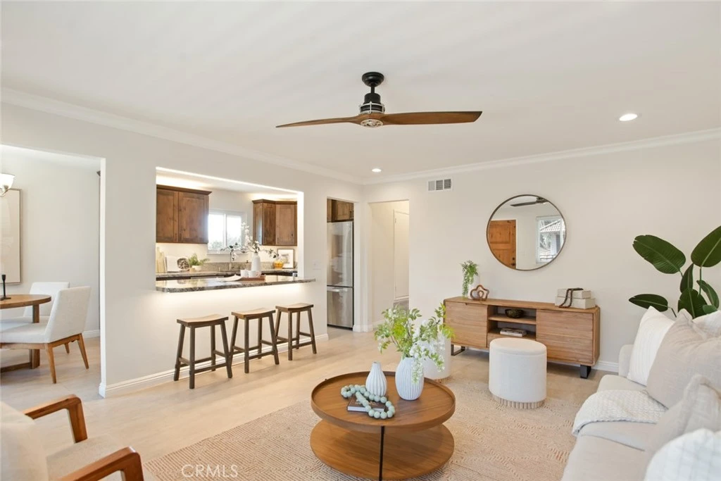 Located in a quiet, gated community in popular South Coast Metro, 3636 Main St is an upgraded 2 bed 2 bath end unit with a large 1 car garage. This move-in ready condo has the perfect flow starting with the front deck, moving into the open floorplan in the main living space and two oversized bedrooms with access to a private back patio. Large upgraded windows and sliders let in tons of natural light to the living room and kitchen while keeping the space private and quiet, BUT you can always enjoy central A/C! The kitchen has been opened up so it flows into the living room and was tastefully upgraded with high-end finishes, marble countertops, and stainless steel appliances. You and your guests can enjoy dining at the large island or in the dining space conveniently located off the kitchen next to the slider that opens to your private deck. The main living has been upgraded with modern laminate floors, custom lighting, and ceiling fan. Down the hall you’ll find a large storage closet perfect for linens or an additional pantry. The hall bathroom has had a full upgrade with custom tile work around the tub and shower. The large vanity and cabinets add so much storage and convenience to the space. Both large bedrooms are carpeted and have been upgraded with recessed lighting and ceiling fans. The primary suite includes a walk-in closet and a large ensuite that is ready for you to personalize it. This unit includes an extra deep 1 car garage which has washer and dryer hookups inside as well as 1 additional parking permit, so 2 dedicated parking spots total. The community has wonderful greenspaces all maintained by the HOA as well as a pool and spa just a short walk from the unit. Come make this turnkey condo your new home!