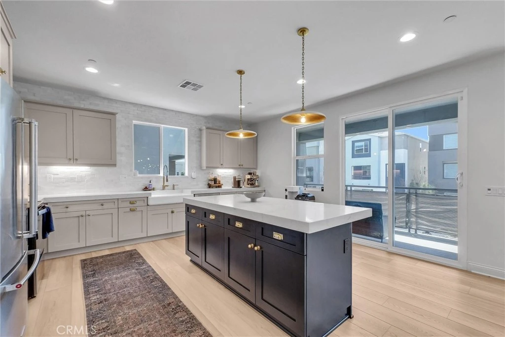 Welcome to the gorgeous and highly upgraded 917 E 3rd ST! This home welcomes you with a generously sized Mother-in-Law suite on the ground floor with an upgraded full bath, walk-in closet and kitchenette. Down the hallway you'll find your spacious 2 car attached garage. As you make your way to the second floor, you're welcomed with a gorgeous modern open concept kitchen with Luxury Vinyl flooring throughout, custom tile full length backsplash, custom brass hardware, 3 inch thick quartz, custom lighting fixtures, and a porcelain farmhouse sink. With tons of natural light throughout all floors, you'll appreciate the high ceilings and custom built in cabinetry. A team favorite of this home is the accent of Gucci wallpaper in the second floor half bath - a very nice touch! The top floor has a comfortable loft space and 3 bedrooms with extra plush carpeting with a nicely sized master bedroom and a suite style bathroom with custom tile, dual sinks, 3 inch thick quartz, and built-in cabinets, as well as complemented with a walk in closet. This impeccable fully detached home also has a wrap around downstairs outdoor gated patio and a second story patio to enjoy the lovely California sun! It also comes with paid off Solar!! Don't miss out on this one of a kind highly upgraded detached home!