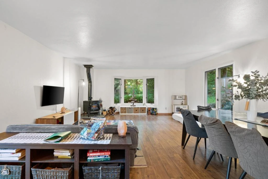 UNDER $1MM! WOW! Currently avail. for viewing with appointment. Welcome to this charming 2 BR, 2 BA single level home. The 1,329 ft. delightful residence offers a cozy living experience set on a spacious 1.43 acre lot. The kitchen is a haven w/ butcher block counters & an island. The family room and dining area seamlessly integrate with the kitchen, creating a warm and inviting space perfect for gatherings. Primary suite includes a sauna! Extensive wrap around decking allows for a delightful blend of outdoor living, grilling, soaking in the wood fired hot tub or strolling down to year round Mill Creek. North coast beaches are a short drive away! The home boasts a variety of flooring options such as laminate, carpet, and vinyl/linoleum, catering to diverse styles. A wood stove and electric heating ensure comfort during cooler months, while double pane windows enhance energy efficiency. Additional amenities include a walk-in closet and convenient inside laundry with a washer and dryer. The property includes miscellaneous structures such as a shed and workshop, offering ample storage and creative space. Located in the highly regarded Bonny Doon School District, this home presents an opportunity for those seeking a peaceful retreat with abundant amenities.