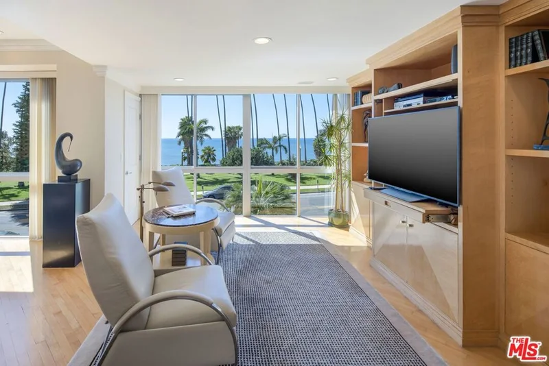 Experience effortless oceanfront living in this generous corner residence on a premier stretch of Ocean Avenue, steps from Montana Avenue's celebrated shops and restaurants in Santa Monica's coveted North of Montana enclave. The living/dining areas and den have been opened into a single, expansive great room wrapped in floor-to-ceiling, wall-to-wall glass that frames panoramic whitewater views of the Santa Monica coastline, flooding the interior with natural light and spilling out onto an open-air corner balcony. The living area features built-in shelving and a wet bar, with hardwood floors throughout. The kitchen offers slab countertops and a breakfast nook beside ample built-ins. Down the hall, two ensuite bedrooms each enjoy ocean views, with the primary suite featuring dual vanities, a soaking tub, and separate shower. The building recently completed a $17,000,000 structural retrofit and offers 24-hour staffed concierge, valet parking, a fitness center, pool, and spa with additional conveniences including two side by side garage parking spaces, in-unit laundry, and secure storage. A well-positioned coastal address for those who value views, space, and doorman living along one of Santa Monica's most sought-after corridors.