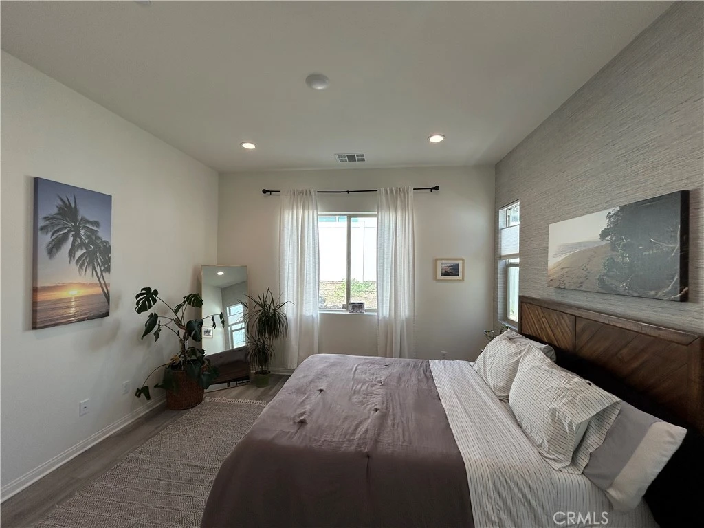 Beautifully upgraded single-story home featuring 4 bedrooms, 3 bathrooms, and a private office, offering exceptional flexibility of use. Built in 2020 with first occupancy in 2021, this thoughtfully designed home showcases an open-concept layout with 10-foot ceilings, recessed lighting, and luxury vinyl plank flooring throughout. Bedrooms, great room, and patio are pre-wired for ceiling fans. The spacious kitchen features granite countertops, soft-close cabinetry and drawers, premium appliances, dual GE ovens with SmartHQ app control, a large island with breakfast seating, and abundant storage. Bathrooms offer matching stone counters, soft-close cabinetry, and floor-to-ceiling tile in shower and tub surrounds for a clean, modern finish. Ethernet wiring throughout provides fast, reliable wired internet—ideal for remote work, streaming, and smart-home needs. Additional highlights include a generous laundry room with utility sink, tankless water heater, leased solar system, whole-house water filtration with reverse osmosis, and smart-home features for garage and exterior lighting. The finished garage features upgraded epoxy flooring and a 220-volt outlet. Enjoy a low-maintenance backyard with concrete patio and vinyl fencing. Located in the desirable Harvest community across from a park with mountain views and resort-style amenities including pool, spa, fitness center, clubhouse, parks, sports fields, community garden, and dog park. Convenient to schools, shopping, and dining, with approximately a 20-minute drive to the beach. Unassuming from the front, this home opens to a light, bright, and spacious interior that truly impresses.