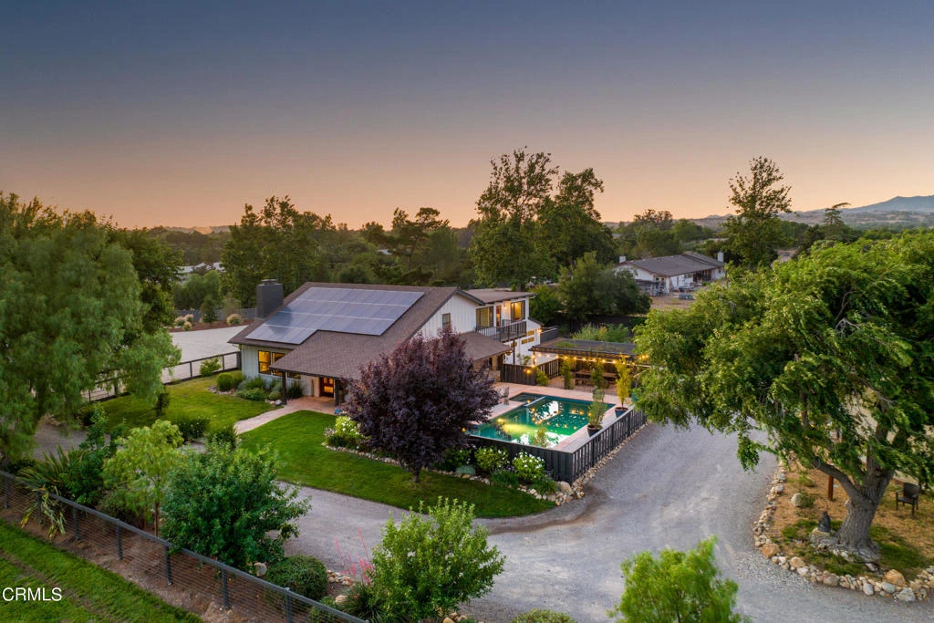 Welcome Home! To this charming Farmhouse-style Santa Ynez Valley equestrian ranch property, complete with pool and spa, an open 'studio' barn that includes open-air concept for your indoor hobbies plus private offices, center aisle horse barn with 5 stalls and tack room, equipment/hay storage barn, multiple irrigated pastures, arena area, serendipitous Airstream and horse trailer glamping area, private well for lush landscaping and irrigation plus local district water, all within a short distance to downtown Santa Ynez restaurants, shopping and wine tasting. Explore your own private farm-style living while gazing out onto expansive Mountain and Valley views. This is the epitome of our Valley living lifestyle, one of adventure and relaxed Country living. Beautifully remodeled home on 5+/- level acres boasts a flexible floorplan of 4 bedrooms, 3 baths, or 3 bedrooms with the 4th serving as a delightfully designed California Closets dreamy closet room for your collection of worldwide fashion wardrobe apparel, to take you from global travel attire to ranch working jeans, boots and cowboy hats. Wonderful architectural design with 2-story high beamed ceilings and white railed loft area. Warm wood floors, cozy fireplace, designer lighting and remote controlled window coverings. Property is complete with solar, water treatment purification, welded pipe fencing and seasonal fruit and olive trees. Once you're here, you won't want to leave!!