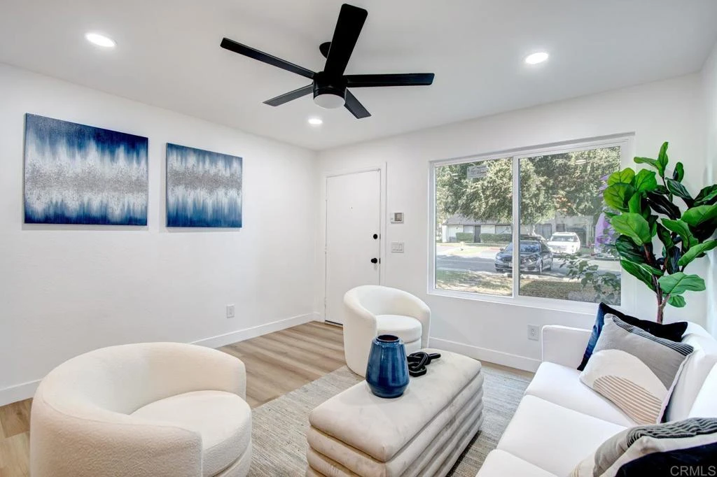 Welcome to this Charming 2-bedroom, 1-bathroom Condo in Santee! The open-concept living room is perfect for relaxing or entertaining. Updated Kitchen: Equipped with shaker style cabinets, quartz countertops and modern stainless steel appliances. Bedrooms and bath are upstairs, downstairs is a spacious living room, dining area, and the updated kitchen. Bonus: the new central air conditioner was installed just last year! The kitchen opens up onto a private, fenced patio, with a storage closet. There is a single space within a multiple-car garage, with storage, and an assigned open parking space in front of the garage. Additional open parking is just in front of the unit, and throughout the complex. For leisure and recreation, the complex features include a large open lawn adjacent to the pool area! The common laundry room is close to the unit.