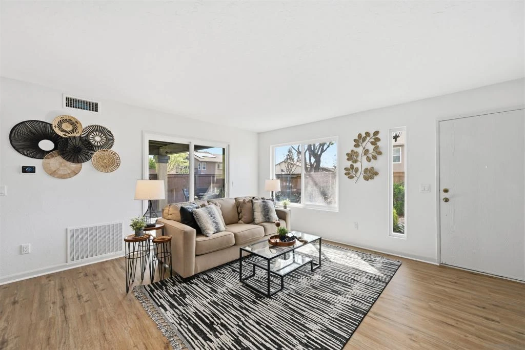 Welcome to 10219 Kerrigan St, a beautifully recently remodeled 3-bedroom, 2.5-bath end unit townhome offering 1,268 sq ft of comfortable living in the heart of Santee. This two-story home features tile and new vinyl flooring on the main level, plush new carpet upstairs, central heat and air, and a convenient downstairs half bath for guests. The functional layout includes in-home laundry and an assigned two-car garage with ample storage. Upstairs, the primary suite opens to a private balcony with scenic foothill views—perfect for morning coffee or winding down at sunset. Enjoy an expansive private patio ideal for entertaining or relaxing outdoors. The well-maintained community offers two pools, playgrounds, and lush greenbelt areas. Located near Santee Lakes, Mission Trails, shopping at Trolley Square, and with easy access to Highways 52 and 125, this move-in ready home offers comfort, convenience, and the best of the Santee lifestyle.