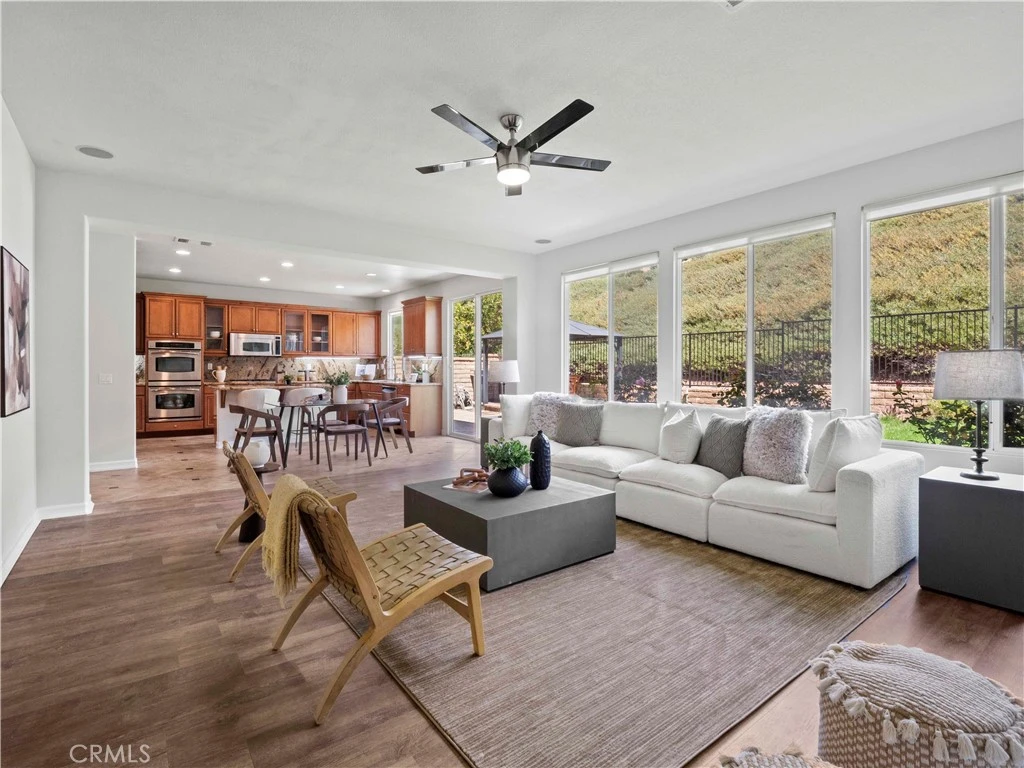 Welcome to your Dream Home! This stunning 5 Bed, 4 Bath, 3,518 sq. ft. masterpiece features Bed and Bath downstairs and No Mello-Roos Tax. From the moment you step inside, you’ll notice the elegant flooring upgrades featuring tile, LVP, and laminate, complemented by timeless shutters and modern recessed lighting. The open floorplan creates a seamless flow throughout, making this home as inviting as it is spacious. The heart of the home is the gourmet kitchen, a chef’s paradise with granite countertops and backsplash, stainless steel appliances, double ovens, and a center island with an eat-in area. With a walk-in pantry, butler’s pantry, and direct access to a large patio, this kitchen was designed for both everyday living and entertaining. It conveniently opens to the dining area and family room, creating a space that’s perfect for gatherings of any size. The family room is an entertainer’s dream, featuring a stunning fireplace with a mantel, custom built-in media center designed for an 80-82 inch TV, and surround sound speakers. Natural light floods the room through its abundant windows, creating a warm and inviting atmosphere. For more formal occasions, the light and bright living room offers its own elegant fireplace and mantel, while the formal dining room flows effortlessly into the kitchen for seamless dinner parties and celebrations. On the first floor, you’ll also find a private bedroom and bathroom, perfect for guests or in-laws. Upstairs, the primary suite is a luxurious retreat, featuring a dual-sided stone fireplace, a spa-like ensuite with dual sinks, a jetted soaking tub, a vanity area, and a huge walk-in closet with custom organizers. The second floor also includes three additional spacious bedrooms, two with a jack-n-jill bathroom, an additional full bathroom with dual sinks, and a huge loft, offering endless possibilities for relaxation or play. The front yard welcomes you with paver stones and a private patio, while the backyard is perfect for entertaining with its large patio, outdoor kitchen, gazebo, and fire pit. This home also features a 3-car attached garage and is located within a wonderful community offering incredible amenities, including a community pool, park, softball field, BBQ picnic area, playground, jogging track, and basketball courts. Be sure to check out the floorplan in the photos and don’t miss your opportunity to make this your Dream Home!