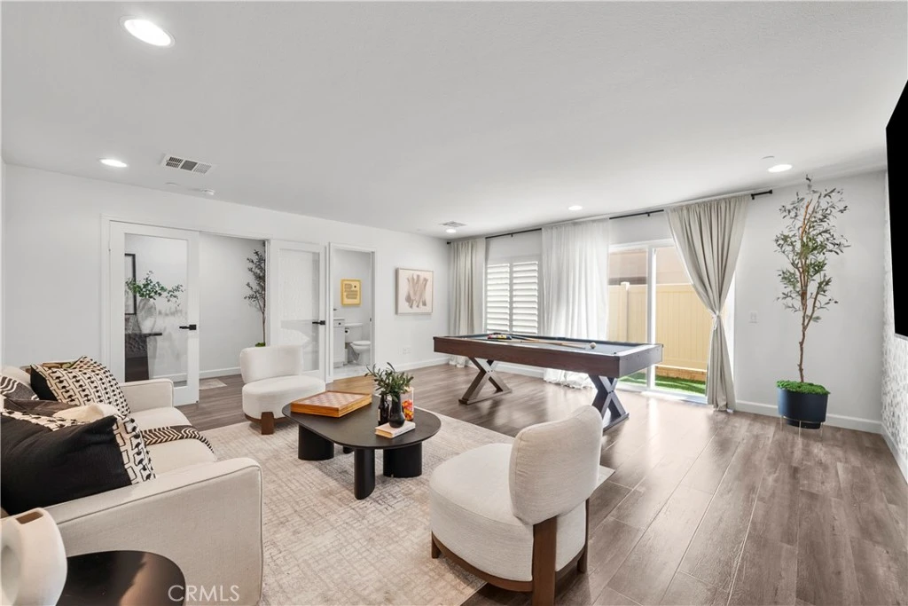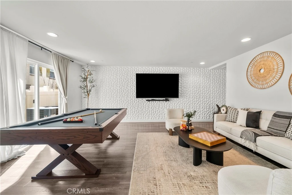Located in the gated community of River Village, this spacious 4-bedroom, 4-bathroom tri-level townhouse offers flexible living, mountain views, and thoughtful upgrades throughout. The entry level welcomes you with a formal foyer that opens to a generous living room—perfect for relaxing or entertaining—along with a full bathroom and a private patio featuring a small turf yard, ideal for outdoor lounging, pets, or a bit of greenery without the maintenance. Laminate flooring and recessed lighting create a clean, modern feel. The second floor features a bright open-concept layout with 9-foot ceilings. The kitchen includes granite countertops, white shaker cabinetry, stainless steel appliances, and ample prep space, flowing easily into the main living and dining areas. This level also offers a bedroom and full bathroom, plus a long balcony with mountain views—perfect for morning coffee or evening sunsets. Upstairs, the third floor hosts three additional bedrooms and two bathrooms, including the spacious primary suite with custom closet organization. A temperature-controlled wine cellar adds a unique and unexpected feature that’s perfect for wine lovers and entertaining. Additional highlights include direct access to a two-car garage with built-in cabinets for extra storage. Residents enjoy River Village amenities including a gated pool and spa, barbecue and picnic areas, and a playground, creating an easy, community-oriented lifestyle. Move-in ready with wonderful pride of ownership, this home offers the comfort, flexibility, and location today’s buyers are looking for.