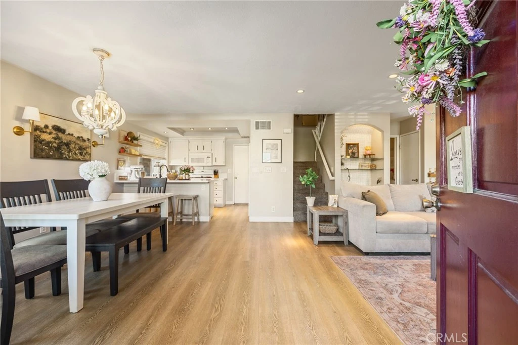 Welcome to this beautifully updated 2 bedroom, 3 bathroom condo offering 1,131 square feet of comfortable living in the heart of Santa Clarita and located within a top rated school district. From the moment you step inside, you’ll appreciate the open floor plan, light wood laminate flooring, recessed lighting, and a welcoming living space centered around a cozy wood burning fireplace. The kitchen is a true highlight, featuring newer quartz countertops, a large fixed island with bar seating, a farmhouse style sink with a sleek modern faucet, updated cabinetry with stylish hardware, and a newer dishwasher. Built-ins overlook the family room, adding both character and functionality to the space. A convenient half bath is located downstairs, making it perfect for guests and everyday living. Upstairs, you’ll find two spacious primary suites, each with vaulted ceilings that create an open and airy feel. The primary bedroom offers a generously sized walk-in closet, while both bedrooms provide ample space and privacy, making this layout ideal for first-time buyers, roommates, or anyone looking for flexible living options. Additional features include in-unit laundry located in the attached two car garage, a newer water heater, updated flooring, and central heating and air conditioning. The garage offers direct access, adding both convenience and storage. The gated community offers a pool and jacuzzi, and the location provides close proximity to restaurants, coffee shops, parks, and everyday conveniences. This move-in ready home combines comfort, style, and location in one of Santa Clarita’s most desirable areas.