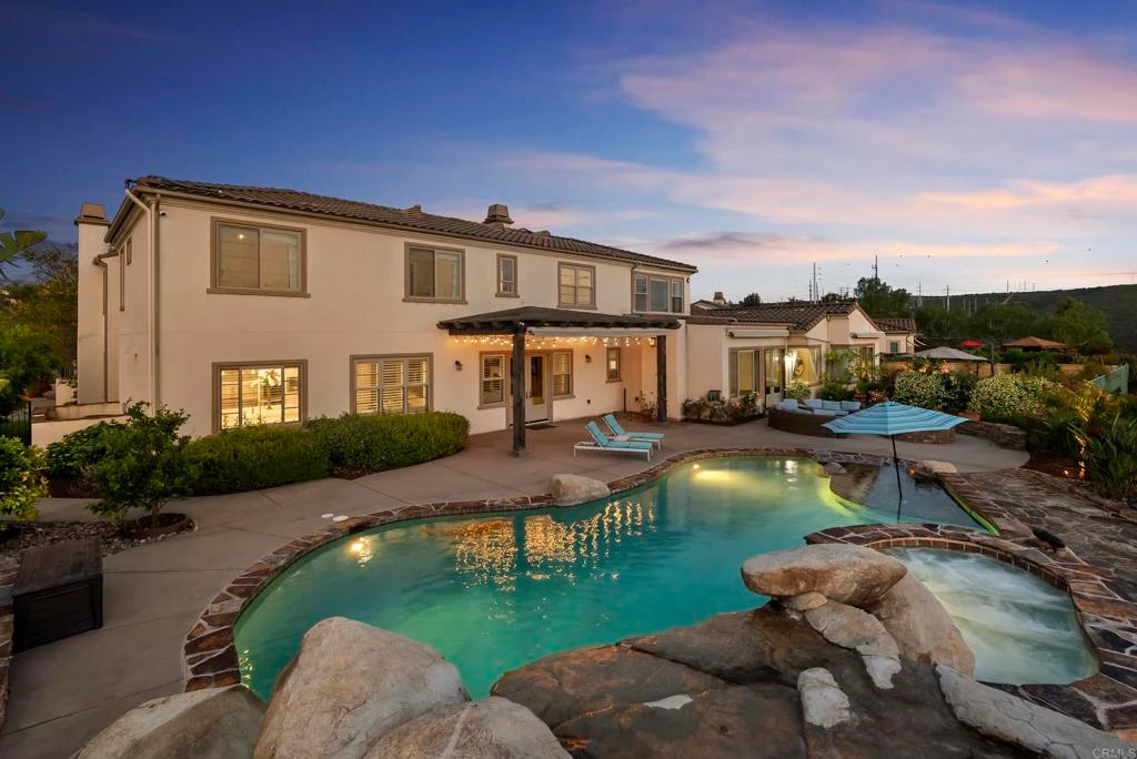 Rare opportunity—two homes on one lot in the top-rated Poway Unified School District! Located in the prestigious Stonebridge Estates community, this beautifully upgraded estate includes a 1,100 sq. ft. guesthouse with full kitchen, laundry, and private garage - perfect for multi-generational living, extended family or private home office. This beautiful and unique estate is situated on a nearly one-half acre on a double cul-de-sac street. Offering commanding views of the surrounding hills and open space, it is located on a quiet and private cul-de-sac street. Home solar to be paid off at close of escrow. Designed for luxury living, this home featuring 5 bedrooms plus 3 customizable flex spaces and has been elegantly upgraded throughout. Features include gleaming plank wood floors, Plantation-style shutters, deep maple-finish cabinetry, private courtyard with fireplace, 4-car garage, resort-style yard and more! The formal living room is striking with stately fireplace and crown molding. French doors from the separate formal dining room with adjoining butler's pantry lead to a private interior courtyard with fireplace. Casual living spaces flow. The huge family room includes a third fireplace with raised hearth and rich built-in cabinets, while the adjacent eat-in kitchen is an aspiring chef's dream. The kitchen features an oversized center island/breakfast bar, slab granite counters, deep maple-finish cabinetry, stainless steel Bosch and Thermador appliances including double oven and six-burner gas cook top, walk-in pantry and large dining nook. The library is equally suited for home office, and a downstairs bedroom is en-suite with its own bath and adjoining separate room, which is unique to this home. Four additional bedrooms and a spacious loft are located upstairs. The spacious master suite includes a retreat and a private bath with dual walk-in closets, spa shower with dual showerheads and separate soaking tub. The rear yard offers a resort-like atmosphere complete with covered patio, gas fire pit, built-in barbecue, saltwater pool with mini grotto and elevated heated spa. The large, private side yard offers gardening, space for a playground, orchard, or any other ideas you may have for this unique and amazing estate. Ideal setup for multi-generational families or guests seeking privacy and independence. In addition to the expansive main residence, the property includes a separate 1,100 sq ft guest house/casita with its own entrance, full kitchen, living area, bedroom, and bathroom - perfect for in-laws, extended family, live-in caregivers, or older children needing space. Separate entrance for privacy. Full kitchen and laundry in the casita. Full private garage.Poway schools with buses for each of the schools serving the community.
