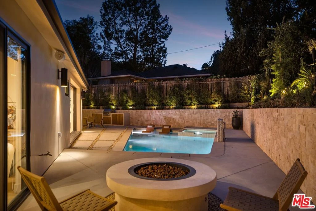 Nestled in the coveted hills of Sherman Oaks, this fully renovated contemporary home offers 4 bedrooms and 3.5 baths with the perfect blend of luxury, style, and functionality. Step through custom double entry doors into an elegant living space highlighted by a stunning travertine porcelain slab fireplace and soaring 11-foot ceilings - wide-plank engineered wood floors flow throughout, while each bathroom showcases a refined Roman clay finish. Expansive Fleetwood sliding doors open to a private resort-like backyard with pool, spa, custom ledger stone throughout, a Pentair system and a full outdoor kitchen including a built-in barbecue, sink, and refrigerator surrounded by mature ficus throughout, ideal for effortless entertaining. This smart home is fully integrated with advanced RTI and ADT systems, featuring upgraded switches, Episode speakers, security cameras, and a premium whole-house audio setup. Thoughtfully designed and move-in ready, this home caters to the most discerning buyers seeking a turnkey, fully furnished sanctuary in one of the Valley's most desirable neighborhoods.