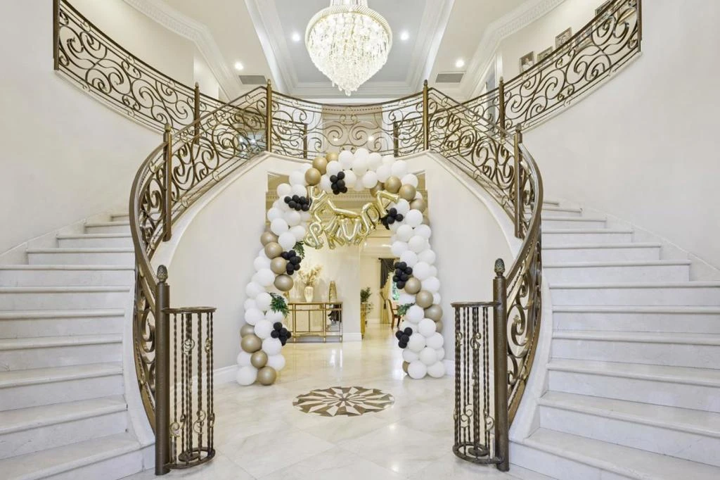 Spanning 9,410 square feet, this stately 7-bedroom estate offers 7 full baths and 2 half baths, delivering exceptional scale, architectural detail, and purposeful design. Formal living and dining spaces are defined by coffered ceilings, crystal chandeliers, and rich wood inlays. The kitchen is appointed with extensive custom cabinetry, generous stone countertops, a substantial center island, and professional-grade appliances. A private office lined with custom shelving offers a refined workspace. The lower-level family room provides a spacious retreat, complemented by a dedicated gym with mirrored walls and fitness equipment. Outdoors, a tiled pool with an integrated spa is framed by mature greenery. An outdoor kitchen equipped with a built-in grill, sink, refrigeration, and bar seating extends entertaining possibilities with ease. Automatic sprinklers maintain the grounds, and a comprehensive security system with cameras, motion detectors, and alarm components enhances peace of mind. Located in Sherman Oaks, moments from Ventura Boulevard, you are close to Westfield Fashion Square, Gelsons Market, Whole Foods Market, notable dining destinations, and Van Nuys Sherman Oaks Park, with convenient access to major freeways connecting you to the greater Los Angeles area.