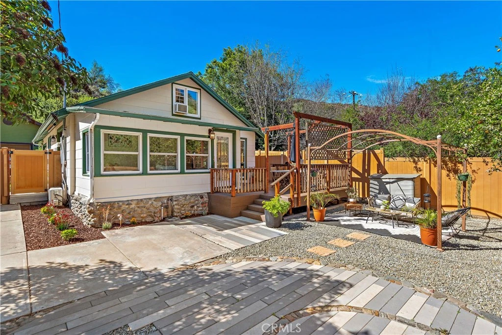 Discover this exceptional canyon retreat, set on a rare 7,400 sq.ft. double lot with an expansive, beautifully landscaped yard. Meandering pathways wind through a stunning drought-tolerant native plant Zen garden, while the custom-built chicken coop adds a delightful touch for those who wish to embrace a sustainable and self-sufficient lifestyle! Step inside to find a very spacious and inviting living room with adjacent dining room + kitchen. Dining room opens seamlessly to a large Trex deck with a redwood pergola, creating an ideal space for al fresco dining and entertaining. The kitchen is thoughtfully designed with ample cabinet space, a pantry for added storage, and sleek stainless steel appliances- all included in the sale. The light-filled primary bedroom showcases beautifully restored wood flooring and baseboards, along with a generous closet. Hallway leads to downstairs bathroom, featuring a stylish vanity, retro tile flooring, and a tub-shower combo. Upstairs, a cozy bedroom provides ample closet space and leads to an incredibly versatile finished attic. Downstairs, an additional room can easily serve as an office or a third bedroom with private entrance. Laundry is conveniently located inside the garage. This home has been thoughtfully upgraded throughout, including a 200-amp electrical panel, a mini-split heating and cooling system in the living room, and energy-efficient dual-pane windows. Additional highlights include copper plumbing, a reverse osmosis water system for both the sink and refrigerator, a newer propane water heater, and a fully fenced yard with durable Duramax fencing- perfect for pets and outdoor privacy. The driveway offers three parking spaces, plus a one-car attached garage. Located near the Cleveland National Forest, Silverado Canyon is a haven for outdoor enthusiasts, with endless hiking and biking trails just minutes away. Come experience the charm and tranquility of canyon living.