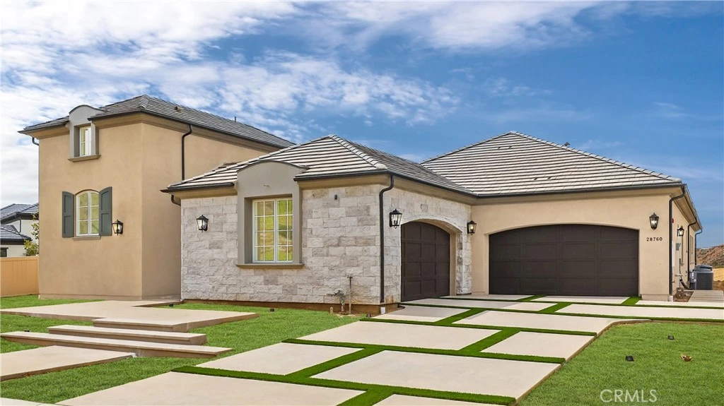 NEW HOME with fabulous City Lights, Sunset and Canyon Views on a cul-de-sac location. Main house is approximately 4,370 single story with 4 bedrooms and 4.5 baths. Stand alone casita/ADU is 927 SF with a family room, kitchenette, half bath down stairs with a en-suite bedroom upstairs and balcony. Located within GATED Saddle Crest community. Price includes folding glass doors into courtyard and to backyard/California room, fireplace in Great room, casement windows, dual WIC in primary plus dual pullmans in primary bathroom, soaking tub, walk in shower. Amazing gourmet kitchen with designer selected split finish kitchen full box with self closing cabinets, island with sink, secondary sink overlooking back yard, breakfast bar, quartz countertops with marble backsplash, two dishwashers, 72 inch refrigerator, Wolf gas range and oven, huge walk in pantry, plus a casual dining and formal dining room. All secondary bedrooms are ensuite. THIS HOUSE IS A MUST SEE! This home is the very popular French exterior with a large, covered California Room off of the great room at Kitchen - see pictures. Bring your toys because this home has a 4-car garage (two separate 2-car garages). Homesite 49 is perched on a hill with a pool sized 17,701 square foot yard is waiting for you to design your dream landscaping, big enough for a pool and more. Pictures are not of actual home.