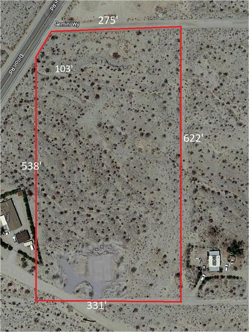 This expansive 4.78-acre parcel is situated on the northeast corner of Dillon and Gemini. The land is primarily flat and designated as R-1A agricultural zoned, making it ideal for a variety of uses. Its location provides convenient access to several key areas: just 30 minutes from downtown Palm Springs, 20 minutes from Desert Hot Springs, and only 10 minutes from the I-10 Freeway.Enjoy 360-degree panoramic mountain and vista views that highlight the natural landscape. The property offers fresh desert breezes and opportunities to observe local wildlife, creating a tranquil and inviting environment.For those seeking to develop their own private paradise, this property presents a unique opportunity. It is close enough to entertainment and modern conveniences yet offers a sense of seclusion and the possibility to live somewhat off the grid. The land includes a potential natural water reservoir and ample space for horses. Additionally, a designated building site has been added, ready for new ideas and development. H2O and electric laterals are located nearby, further enhancing the property's appeal.