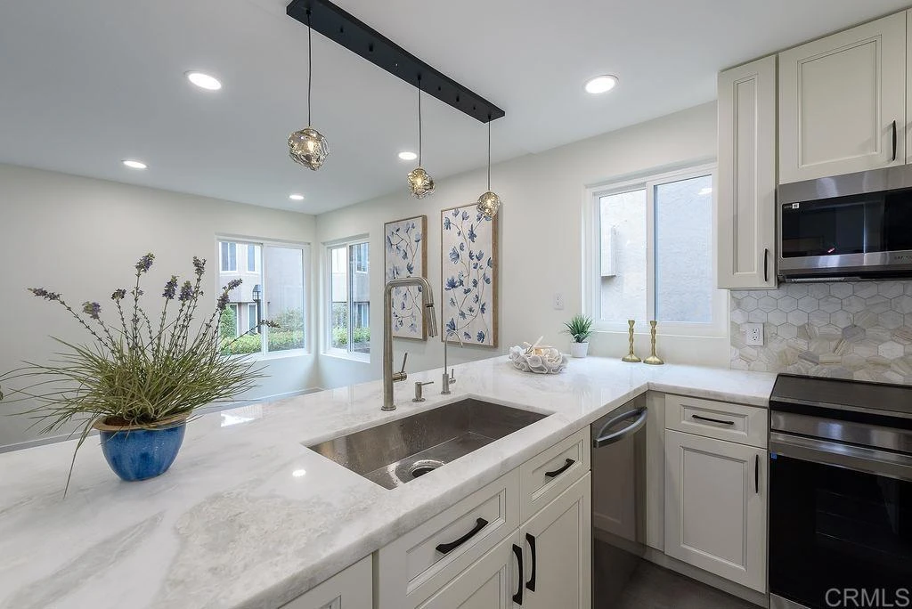 Peaceful Coastal Living in Solana Beach Experience the ease of single-level living in this beautifully remodeled first-floor condo located in The Villas, a highly desirable community in the coastal enclave of Solana Beach. This 1-bedroom, 1-bath home has been thoughtfully upgraded with over $80,000 in high-end finishes and smart features—perfect for those seeking a relaxed, low-maintenance lifestyle near the coast. Step into an open and inviting layout featuring a bright living and dining space with new dual-pane windows and sliding glass doors that frame peaceful garden views. The fully remodeled kitchen offers a blend of beauty and function, showcasing marble countertops, a Samsung Smart induction range, a Smart refrigerator, and plenty of cabinet space. A breakfast bar adds casual dining convenience, while the interior laundry with 220V hookups provides everyday ease. Enjoy year-round comfort with a Bosch multi-zone HVAC system, and retreat to the spacious bedroom with direct access to a serene patio—ideal for enjoying a cup of coffee or unwinding in the fresh air. This residence is tucked inside the community away from street noise, offering added tranquility. The Villas community features lush landscaping, a heated pool, spa, waterfall feature, racquetball courts, and clubhouse—perfect for anyone who values a relaxing, amenity-rich lifestyle just minutes from the beach, Cedros Design District, and the Solana Beach train station. A covered carport with additional storage is included. Schedule your private tour today and discover the blend of comfort, quality, and coastal charm that awaits you in Solana Beach.