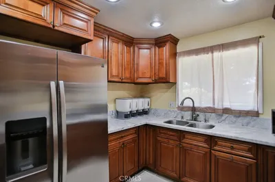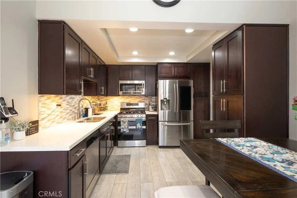 This beautifully upgraded, single-level end-unit home boasts vaulted ceilings, central air conditioning, and a light, bright, and airy ambiance—offering the perfect blend of comfort, style, and functionality. Inside, you'll find fresh, modern finishes throughout—from rich cabinetry and quartz countertops in the kitchen to a sleek tile backsplash and wood-style porcelain tile flooring that adds a touch of elegance. The open-concept living and dining areas feature vaulted ceilings and recessed lighting, creating an airy, spacious feel that's ideal for both relaxing and entertaining. All three bedrooms are thoughtfully laid out, offering flexibility for guests, a home office, or growing household needs, making this rare single-story, 3-bedroom layout especially desirable. Both bathrooms have been tastefully renovated with spa-inspired tile work, updated vanities, porcelain tile flooring, and high-quality fixtures that add a sense of luxury to your daily routine. The primary bathroom features an exhaust fan with dual lights and a Bluetooth speaker. Enjoy the convenience of central Air Conditioning for year-round comfort, and take advantage of the spacious two-car garage that provides ample storage and parking. One of the standout features of this home is the large patio area—perfect for hosting guests, enjoying outdoor meals, or simply unwinding in the fresh air. A private, covered spa, low-maintenance synthetic lawn, classic brickwork, lush tropical plants, and overhead shade screens create a serene outdoor oasis—your own private retreat right in the backyard. The home is ideally situated facing a wide greenbelt, providing peaceful views and added privacy with no direct front-facing neighbors. Whether you're sipping your morning coffee or taking a leisurely stroll, the lush grassy area in front adds to the charm and openness of the setting. Located in a well-maintained community close to parks, restaurants, shopping, and easy freeway access, this home delivers an ideal balance of privacy, practicality, and modern upgrades. With everything on one level, it’s perfect for anyone looking for easy, accessible living without sacrificing style or space. This move-in ready home is a rare find and offers all the amenities you need to enjoy Southern California living at its finest.