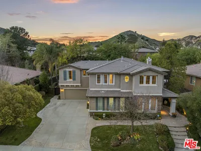 Welcome to this stunning Executive Pool Home, ideally situated at the end of a beautiful cul-de-sac in upper Stevenson Ranch in the highly desired Twilight Vista tract. From the moment you arrive, the home makes a lasting impression with exceptional curb appeal, highlighted by a private courtyard with professional landscaping and tranquil fountains. Through the grand double doors you will find a breathtaking formal entry, where soaring ceilings and a dramatic wrought-iron staircase create a striking focal point. Rich marble-inspired 20” x 20” tile flooring spans the lower level, while the upper level is beautifully finished with warm wood flooring, creating a cohesive blend of elegance and comfort throughout. Spanning nearly 3600 sq ft, the expansive floor plan features 5 bedrooms, 5 baths, a huge great room, formal dining, office nook and upstairs laundry. The expanded great room includes modern wood slat wall detail, ambiance lighting and tons of windows filling the space with natural light. At the center of it all, the newly updated kitchen impresses with an oversized center island, white shaker cabinetry, gorgeous granite counters, walk in pantry, stainless appliances, and modern hardware. The space opens seamlessly to the inviting great room perfect for hosting large gatherings. The main level also features a generously sized bedroom and a private full bath, ideal for guests, multigenerational living, or a home office. Upstairs, the primary suite offers a true retreat, complete with a private balcony capturing sweeping views of Stevenson Ranch and the surrounding mountains. Thoughtfully re-designed with a huge walk in closet with custom built ins and a spa-inspired bath featuring a soaking tub and oversized walk-in shower. The upper level also includes 3 additional well appointed bedrooms, and a versatile flex space ideal for an office. The backyard is designed for both relaxation and entertaining, featuring a newer pool and spa, lush landscaping, and expansive patio spaces perfectly positioned to take in the surrounding views. Additional highlights include plantation shutters, surround sound, enhanced security, solar, Tesla charging station, newer interior and exterior paint, new HVAC systems, tankless water heater, new windows (downstairs) and a 3 car attached garage. Enjoy the benefit of a low HOA, no mello-roos and access to highly acclaimed award winning schools. Close to shopping, restaurants, gorgeous parks and easy access to the 5 freeway.