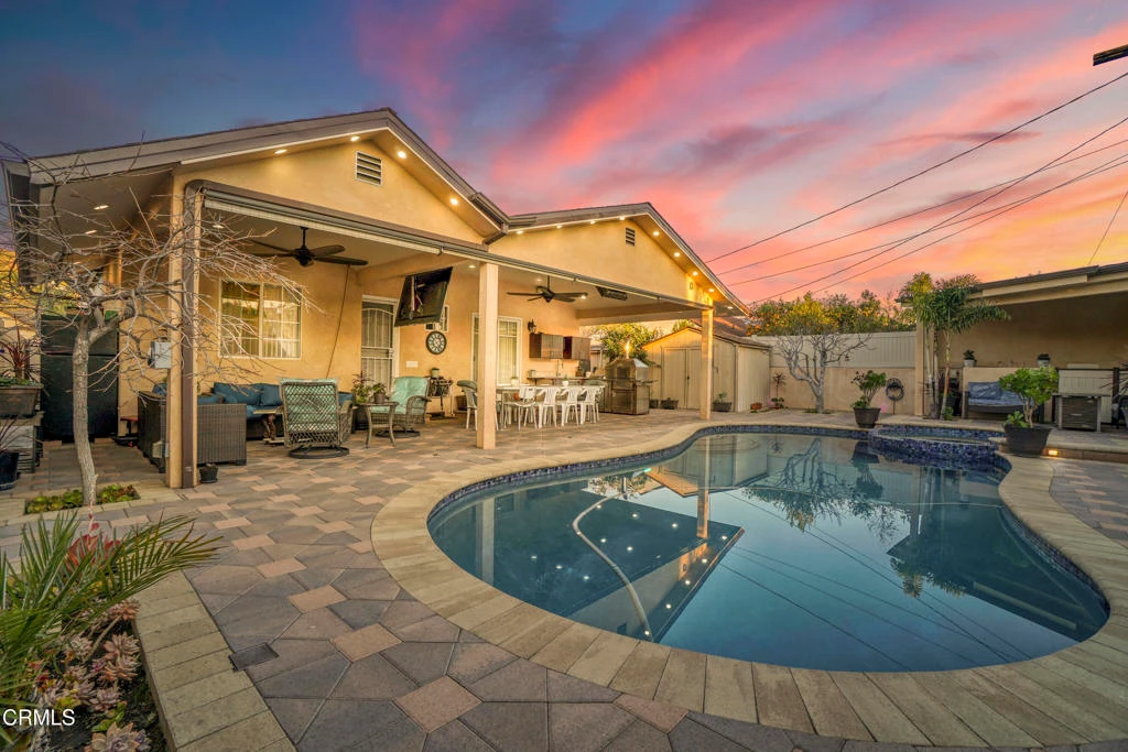 This stunning 3-bedroom, 2-bathroom home is designed for comfort, style, and family living. Fully remodeled just two years ago, the property offers thoughtful upgrades and meticulous attention to detail throughout.Step inside to find a bright and airy open- floor-plan interior. The living room is enhanced by recessed lighting and a beautifully designed bar featuring its own cabinets and a sleek peninsula. The kitchen features sleek cabinetry, high-end finishes, and plenty of storage to delight any chef. Each bedroom is a retreat in itself, with custom floor-to-ceiling closets offering ample space for everyone in the family.The outdoor spaces are an entertainer's dream. The spacious backyard features a stunning heated saltwater pool and spa, illuminated with LED lights and completely redone just two years ago.The front and backyard have been fully paved, creating a seamless flow for relaxation, convenience, and family gatherings. The unique outdoor kitchen elevates your hosting potential, perfect for barbecues and al fresco dining. Additionally, the property boasts a variety of mature fruit trees, including persimmon. fig, mandarin, lemon, and more. These trees provide an abundant harvest and add a charming, natural touch to this already impressive outdoor spaceBeyond its immediate charm, the property offers excellent potential for an accessory dwelling unit (ADU) for added value. Whether you're looking to raise a family or enjoy a luxurious retreat, this home blends modern upgrades with warm, inviting spaces, making it a perfect place to create lasting memories.