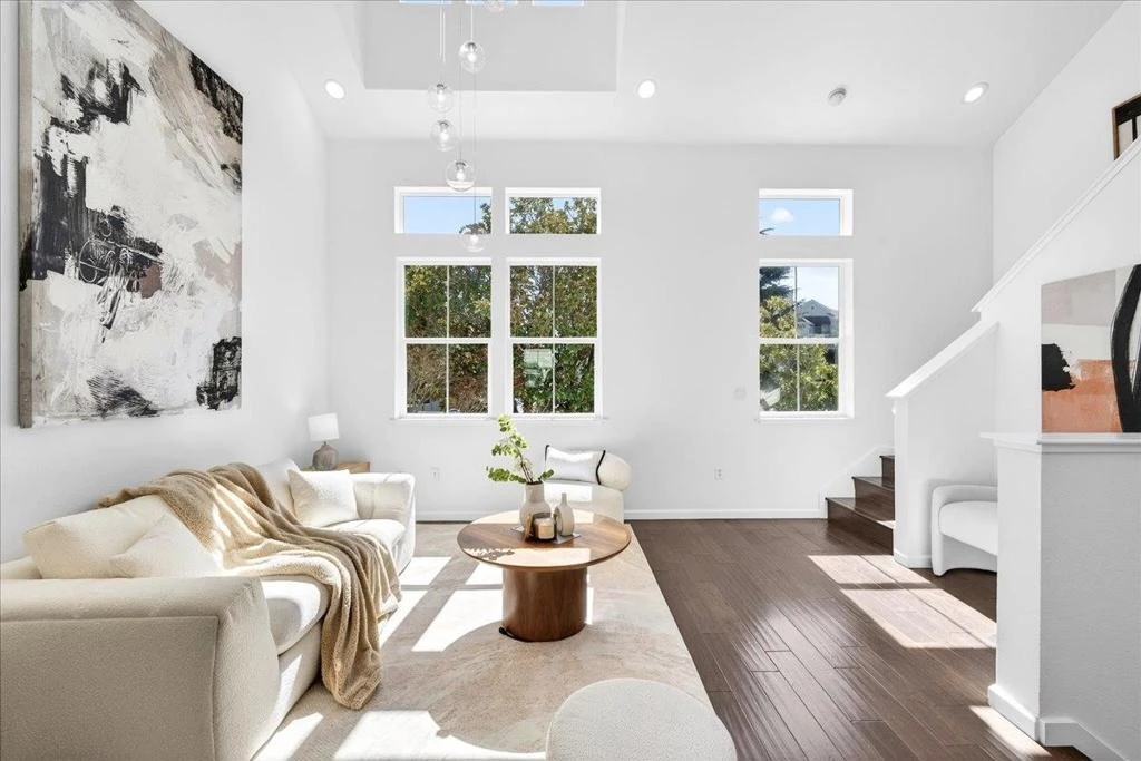 Stunning Renovated Sunnyvale PUD Townhome with Ultra-Low $90 HOA First Time on the Market! Bright and modern, this move-in-ready home offers exceptional versatility with a bedroom and full bathroom on every level, including a ground-floor suite. Soaring ceilings and an open design showcase fresh designer paint, elegant wood flooring, brand-new tile, and plush new carpet. The modernized kitchen and bathrooms shine with chic white cabinetry, sleek quartz countertops, and contemporary LED lighting. The top-floor primary suite features a spacious walk-in closet and a refreshed dual-sink vanity bath. High-value upgrades include brand-new dual-zone A/C units, upgraded dual-pane window glass for energy efficiency and sound insulation, and inside laundry with a new washer and dryer. Enjoy a private fenced front yard with a lush new lawn and professional landscaping, plus a convenient two-car side-by-side garage. Centrally located just minutes from major tech campuses like Apple, Google, Meta, and LinkedIn, Caltrain, shuttle stop, local parks, Magical Bridge playground and the vibrant dining and shopping of Downtown Sunnyvale. Modern style, incredible value, and unbeatable Silicon Valley convenience - a rare find!