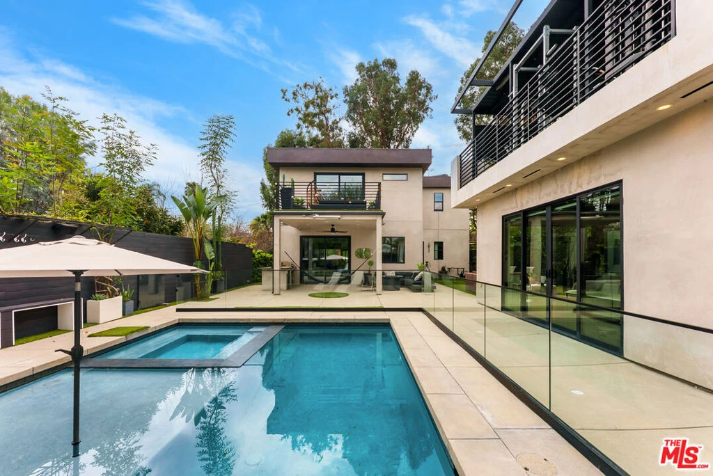 Stunningly updated and fully furnished, this gated South-of-the-Boulevard two-story residence blends modern design with elevated comfort complete with a separate pool/guest house and a show-stopping rooftop gym. Thoughtfully remodeled with exceptional attention to detail, the home offers a bright, open-concept layout where the spacious dining area flows effortlessly into a refined living room featuring a custom-built bar - perfect for entertaining. The sleek chef's kitchen is outfitted with premium appliances, designer finishes, and an oversized center island with seating. Wide-plank oak flooring runs throughout, enhancing the home's calm, contemporary aesthetic. A main-level bedroom with private side-yard access makes an ideal office, guest suite, or client-friendly workspace. Upstairs, the primary suite feels like a retreat, featuring dual walk-in closets, a generous balcony with scenic views, and a spa-inspired bath with double vanities, an oversized shower, and stylish barn-door detailing. Two additional en-suite bedrooms, a shared balcony, and a dedicated laundry area complete the second floor. The detached pool/guest house (converted from the original garage) includes a full kitchen with full-size refrigerator, comfortable living space, and a bath with direct pool access. The outdoor spaces are equally impressive. A private, landscaped front yard welcomes you behind secure gates, while the entertainer's backyard features a sparkling pool and spa, built-in BBQ, fire pit, and multiple lounge areas that truly shine in the evening hours. Smart home features add convenience throughout. Just moments from Ventura Blvd.'s shops and dining, with easy access to the 101 Freeway, this exceptional property delivers privacy, style, and convenience in one beautifully curated package. No smoking. Pets negotiable. Total square footage includes the guest house. No garage on site; ample street parking available.