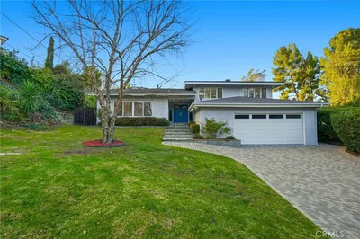 Set behind a 6-foot motorized privacy gate and approached by a long driveway, this single-level mid-century modern retreat offers sweeping views across the San Fernando Valley and a rare sense of seclusion. Thoughtfully taken down to the studs approximately ten years ago, the home was comprehensively reimagined with all major systems upgraded alongside refined, timeless finishes throughout. Upon entry, a dramatic sunken living room with fireplace sets the tone, seamlessly flowing into an open-concept layout designed for both everyday living and entertaining. Engineered white oak flooring runs throughout the home, complemented by aluminum-framed windows and sliding doors that frame the valley views and flood the interiors with natural light. The dining area is a true focal point, showcasing views of the northern valley and ideal for hosting memorable gatherings. A second sunken living space offers a cozy, elevated lounge—perfect for media, relaxing, or taking in the view from a different perspective. The chef’s kitchen features custom teak cabinetry, a Sub-Zero refrigerator, Wolf cooktop, oven, and microwave, generous storage, and bar seating—designed to function beautifully while anchoring the heart of the home. The residence offers four bedrooms and three-and-a-half bathrooms across a thoughtfully separated floor plan. One wing includes three bedrooms, highlighted by a spacious primary suite with walk-in closet and en-suite bath featuring a sunken soaking tub. The second-largest bedroom offers near-primary proportions with its own walk-in closet and shares a Jack-and-Jill bath with the third bedroom. The opposite wing provides a private fourth bedroom with authentic terrazzo flooring, an adjacent bathroom, and a dedicated laundry area—ideal for guests, extended family, or a home office. Outdoors, offers multiple entertaining areas, including a newer swimming pool, deck, and cabana area, as well as outdoor seating and dining with picturesque view settings. Centrally located near major freeways, fine dining, and premier shopping, this gated Tarzana residence delivers architectural integrity, privacy, and panoramic views in one exceptional offering.