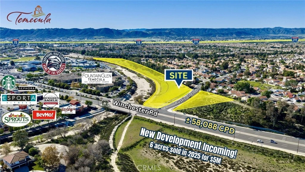 ±5.36-acre corner development site on Winchester Road in Temecula with HEAVY TRAFFIC of approximately 58,088 vehicles per day. The property offers prominent frontage on both Winchester Road and Margarita Road, providing strong visibility and access along one of Temecula’s main commercial corridors. The site is zoned Public Institutional (PI), intended for essential community-serving uses. Highest and best uses include medical and dental offices, outpatient clinics, professional office campuses, educational facilities, day care centers, religious facilities, and government services. The zoning is well aligned with surrounding residential density and continued demand for healthcare and professional services in the area. The ±5.36-acre parcel supports up to three (3) potential pad sites, allowing for a multi-building campus or phased development. A unique grading advantage allows excess dirt from one portion of the site to be used to bring other pads to grade, improving overall development efficiency. Located near the I-15 Freeway and surrounded by major residential and commercial development, the property sits in an active growth corridor. The land across the street was a 6.2 acre lot recently acquired by SRM Development for a sale of $5 million in 2025 - in which they specialize in Mixed Use and multifamily developments. Offered at $950,000, this is a rare opportunity to acquire a high-visibility property that is infill and surrounded by continual growth and progress the desirable city of Temecula, CA. *Buyer to verify any and all marketing information to satisfy themselves.*