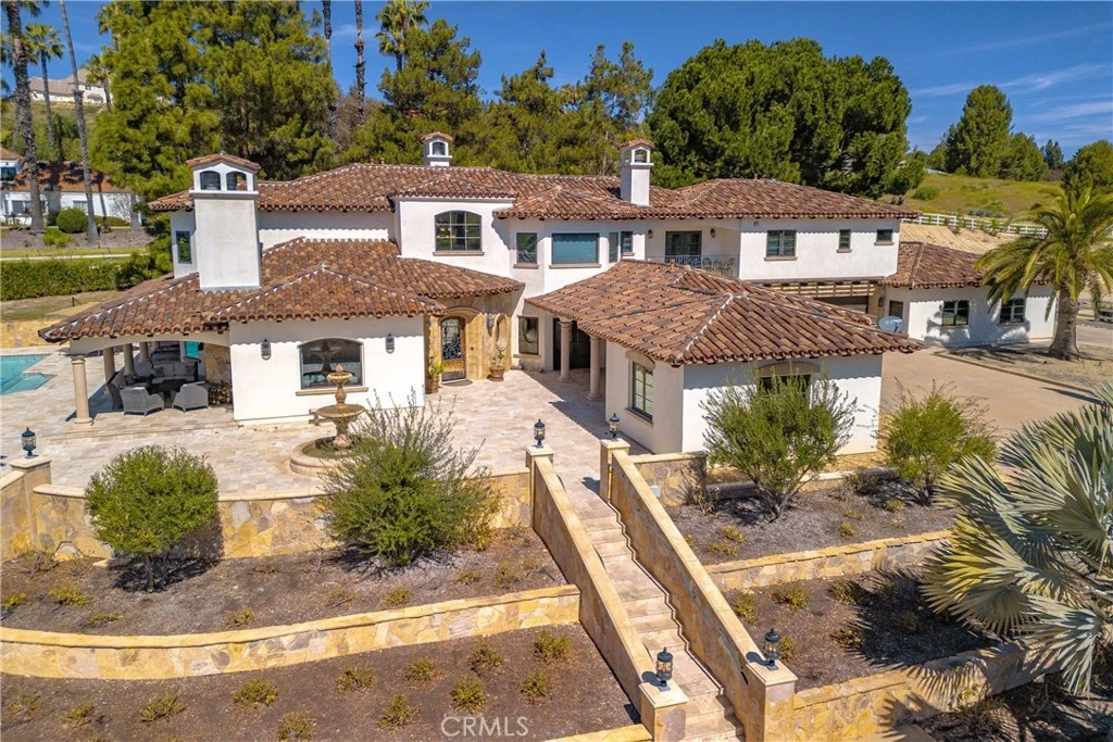 ****A TRULY MAGNIFICENT LUXURY MEDITERRANEAN ESTATE LOCATED IN THE HEART OF TEMECULA IN SANTIAGO ESTATES!!*** Over 6,500sf with 7 en suite bedrooms plus 7.5 Bathrooms are included here with a Pool House and a separate Guest House, ALL with the finest quality features. Inviting resort style pool and spa with expansive decks and sunning areas. Three Tiered European Fountain at Entryway. Full size Tennis Court for your sports enthusiasts, Custom Car Fans will love the 6 car attached garage with 3car/ 3 car configuration. Plus a gigantic RV Barn/ extra car storage, or 4 stall horse barn. Equestrians can also partake of the horse arena area and local trails. The Gourmet's delight Kitchen with high end 6 burner stove, vegetable sink, Farmer's sink, Built in GE super size refrigerator/ freezer all with plenty of areas for entertaining your guests. The property is very private with security gated entry gates, fully fenced, and high hedges amid mature landscaping throughout. Ample on site parking, massive motor court, multiple driveways, and room for all your toys! Properties such as this one rarely come on the market. You are centrally close to all schools, shopping, Old Town, freeways, wineries, Casino. Don't miss out on this incredible opportunity as there is only one, and you deserve to be the winner!