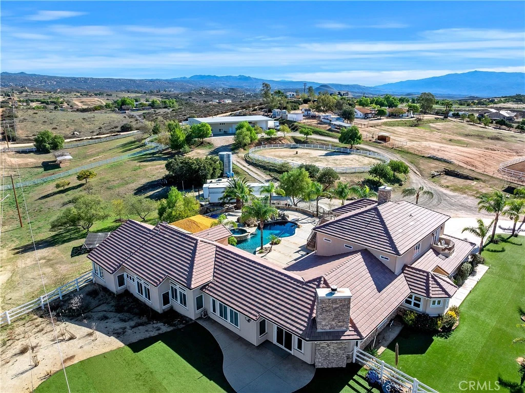 Perfectly situated for relaxed, luxurious Wine Country living, this custom estate includes both a stunning main residence and a spacious 2-bedroom guest house & massive RV garage. Set on nearly 5 acres with sweeping views. The primary home offers over 4,671 sq. ft. with a free-flowing floor plan, spacious bedrooms with vaulted and open-beam ceilings, rich wood flooring, and exceptional stone tile work throughout. The chefs kitchen impresses with stainless steel appliances, granite counters, double ovens, and a large walk-in pantryseamlessly opening to the warm, inviting family room highlighted by a dramatic floor-to-ceiling fireplace. The elegant primary suite is a retreat of its own, featuring a fireplace, wood-beamed ceilings, an expansive layout, and two private balconies overlooking Temecula Wine Country. The luxurious primary bath is beautifully appointed with dual sinks, a spa tub, walk-in closet, and refined finishes. An office with built-ins provides the perfect space to work from home. Step outside to your own private resort: a custom saltwater pool and spa with waterfall, slide, and diving board, plus an impressive outdoor kitchen complete with stainless steel appliances, refrigerator, granite counters, plasma TV, swim-up bar, fire pit, and custom tiki cover. The grounds are tastefully landscaped with extensive decking ideal for entertaining. A true equestrian estate, the property offers paddocks, covered turnouts, and a riding arena. The impressive workshop is paired with a HUGE RV garage, providing exceptional space for large coaches, car collections, or contractor equipment. Above the RV garage sits the full 2-bedroom, 1-bath guest house with kitchen and living roomideal for extended family, visitors, or income potential. An additional studio with its own bathroom offers space for a gym, office, or creative retreat. With paid solar and well water, this estate is both efficient and cost-effective, perfect for equestrians, contractors, car collectors, or anyone seeking the ultimate Temecula Wine Country lifestyle.