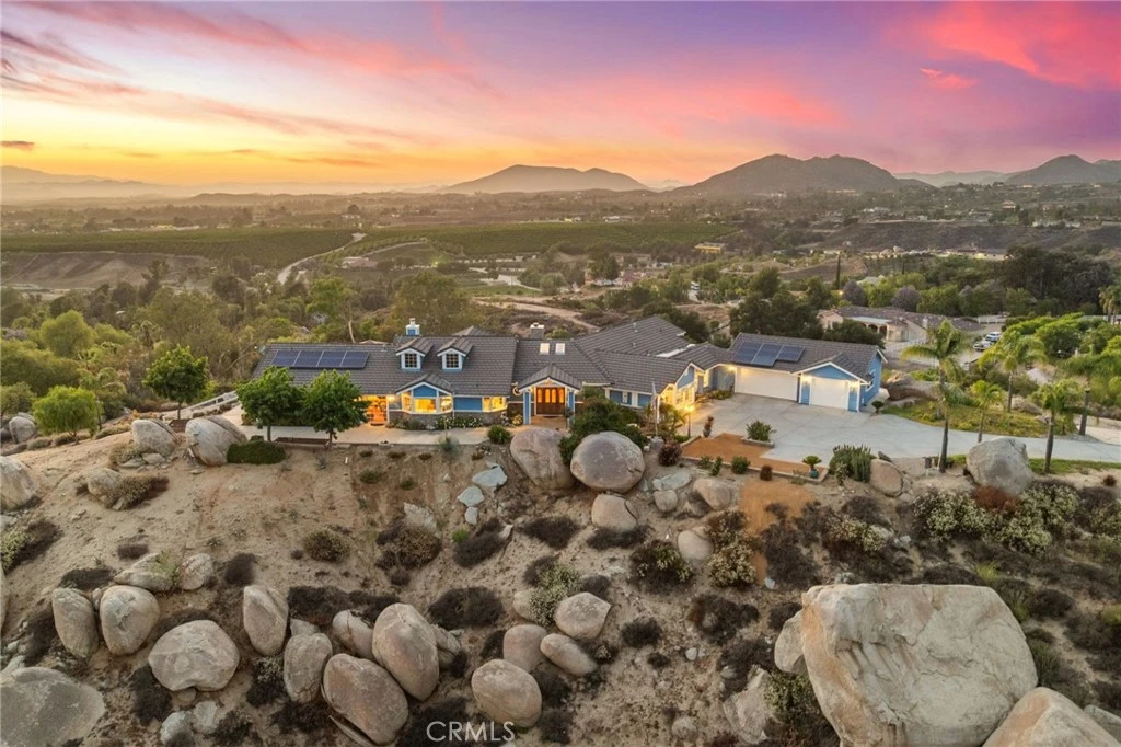 Stunning Panoramic Views | Private Gated Entry | High Ceilings | Amazing Floor-plan… You won’t want to miss this one! Welcome to your dream retreat in Glenoak Hills, nestled in the heart of Temecula Wine Country. This stunning custom home sits elevated on nearly 5 acres, offering truly breathtaking panoramic views of both sunrise and sunset—visible from nearly every room in the house. With 4,215 square feet of living space, the home features 4 bedrooms plus a generously sized bonus room with its own private bathroom, ideal for guests or a home office. The open floor plan boasts soaring ceilings, large windows, and a timeless custom design that creates a warm and inviting atmosphere. Surrounded by dramatic natural boulders and beautifully manicured landscaping, the home offers gated, private access and a spacious 3-car garage. The formal living room features vaulted ceilings and a fireplace that frames the stunning views of nearby wineries and rolling vineyard hills. A large formal dining room and an open-concept kitchen make entertaining a breeze. The oversized primary suite is a true sanctuary with eight windows, double French doors, a vaulted ceiling, and an expansive walk-in closet. The spa-like primary bathroom includes a soaking tub, walk-in shower, and separate vanity area. Step outside to your private backyard oasis, complete with two covered patio areas, a built-in BBQ, and a scenic deck perfect for soaking in vineyard views and wine country sunsets. With solar, plenty of space for future additions or hobbies, and a location just minutes from wineries, shopping, and within the award-winning Temecula school district—this home offers the ultimate blend of luxury, privacy, and lifestyle.