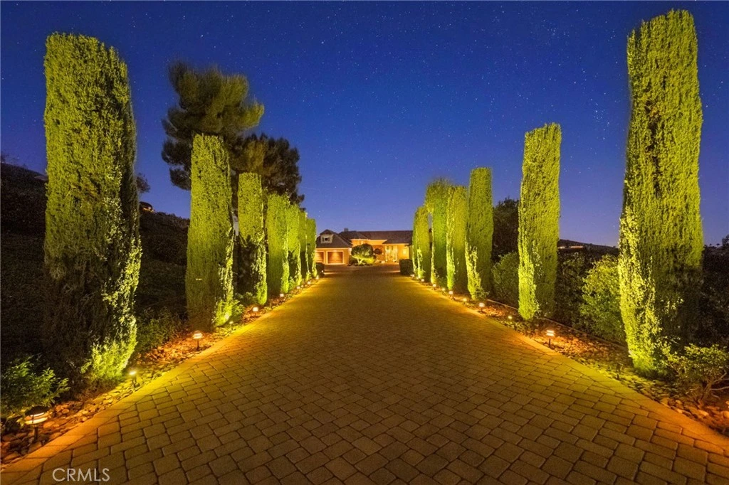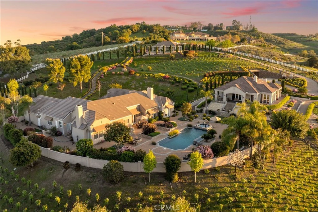 One-of-a-kind estate located just 5 minutes from the charm & culture of Old Town Temecula. Set behind 3 private gated entrances, this sprawling 4.19 acre compound features 3 separate single-story residences & an underground wine cellar all totaling approx. 6100 sq ft, masterfully positioned to capture breathtaking sunset views across rolling hills. The grounds truly set this estate apart; meticulously manicured landscapes framed by stately Italian cypress trees create an outdoor setting unlike any other. A dramatic stone stairway leads from the main home to the elevated studio residence. Entertain w/ ease and elegance w/resort style amenities; sparkling pool, two separate spas, water features, outdoor fireplaces, 2 putting greens, a sports court, & a post-tensioned tennis court w/ breathtaking views. Plus 2 built-in BBQ islands & pizza oven. Approx. 30,000 sq ft of stone pavers weave through the property. The main residence is approx. 3,275 sq ft w/ travertine flooring & architectural arches. It features 3 bedrooms, office, & 3.5 baths. The gourmet kitchen complete with granite countertops, 2 sinks, stainless steel appliances, built-in refrigerator, walk-in pantry, wine fridge, butler's pantry, & bar seating-all flowing seamlessly into the family room w/ views of the pool & gardens. The primary suite offers a private retreat w/ its own fireplace & French doors leading to the amazing pool & spa. The guest house offers approx. 1,600 sq ft of luxury living w/ 2 bdrms, 2 baths, a chef’s kitchen, & fully retractable glass doors opening to commanding views of the surrounding countryside. At the estate's highest point, the studio offers approx. 600 sq ft of open-concept living, complete with an elevated desk area, curved wine bar, a built-in spa, putting green, rooftop lounge, ATV-sized garage, & unmatched panoramic vistas. A 600 sq ft stand-alone reinforced concrete wine cellar is the perfect sanctuary for wine-making enthusiasts - complemented by approx. 1,000 wine grapevines and 21 table grapevines, as well as approx. 100 avocado trees, and various fruit trees. Additional features include upgraded mahogany garage doors, extensive landscape lighting, whole house & outdoor sound systems, multiple whole-house fans for year-round comfort, & a comprehensive security system. Perfect for a multigenerational compound, vineyard retreat, or entertainer's paradise, this Temecula estate redefines California luxury living with a setting that must be seen to be believed.