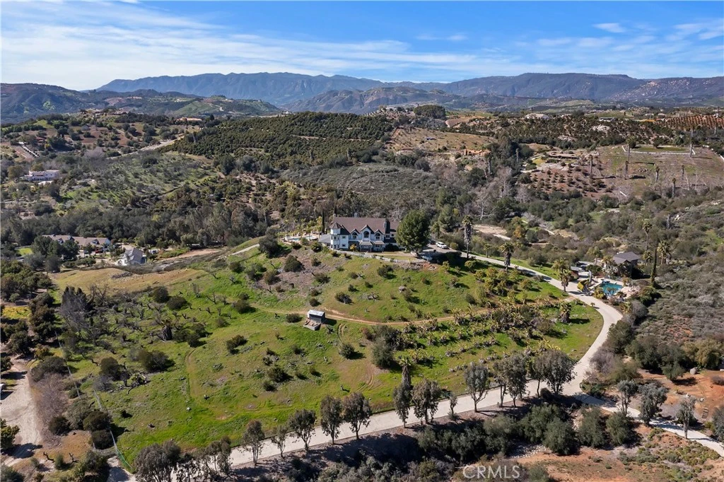 Luxury at its finest with this stunning De Luz Estate pool home. This gorgeous property also includes a 1200+ Sq. Ft. guest house with 2 bedrooms 2 bathrooms and a 2 car garage and pool of it own, all just minutes from Old Town Temecula, schools, shopping, dinning, freeway and entertainment. You will be in awe at the spectacular 360 degree views from every room throughout this stunning 4,861 sq. ft. estate home, positioned on a over 5+ acres of impressive land. As you drive up the private driveway, enjoying the breathtaking views, you'll come upon an orchard that consists of mango and grapefruit trees, you'll then pass by a lovely guest home, excellent potential rental opportunity or for guests, friends or family to live in. When entering the main home through the double front doors, you'll immediately appreciate it's grand scale, with the beautiful scrolling iron banister, coffered ceilings, exquisite woodwork, hardwood flooring, and open floor plan with every bedroom consisting of their own bathrooms. Enjoy a cozy evening by the fire, reading a book, or chatting with friends in the lounge/den with beautifully crafted full wall, wood, built-in wine racks and cabinets, granite counters, and wainscot throughout. This room is a must see! Looking to entertain, then you'll enjoy the huge family room, formal dining room and beautiful kitchen with eating area with never ending views. Need room for guests, no problem, down the hallway you'll find a bedroom with walk-in closet and a full bathroom. There is also a separate powder room conveniently located off of the family room and a gigantic laundry room with plenty of storage. Upstairs you will be stunned by the craftsmanship. The primary bedroom has its own retreat for reading or tv time and the master bedroom has a private 3 sided fireplace. Enjoy a spa day in the master bathroom with jetted tub facing overlooking the picturesque and never-ending views. There are 2 more bedrooms upstairs with stunning full bathrooms and cathedral ceilings, separate bonus area with balcony, and another bonus room with built-in desks and storage for playroom, home office or a plethora of other uses. The backyard of this stunner consists of a pool and spa, BBQ and firepit. Sit by the fire and enjoy the stars with your unobstructed view. Looking to have some animals, there is plenty of room for barn, gardens, vines, pickleball court, or whatever you heart desires.