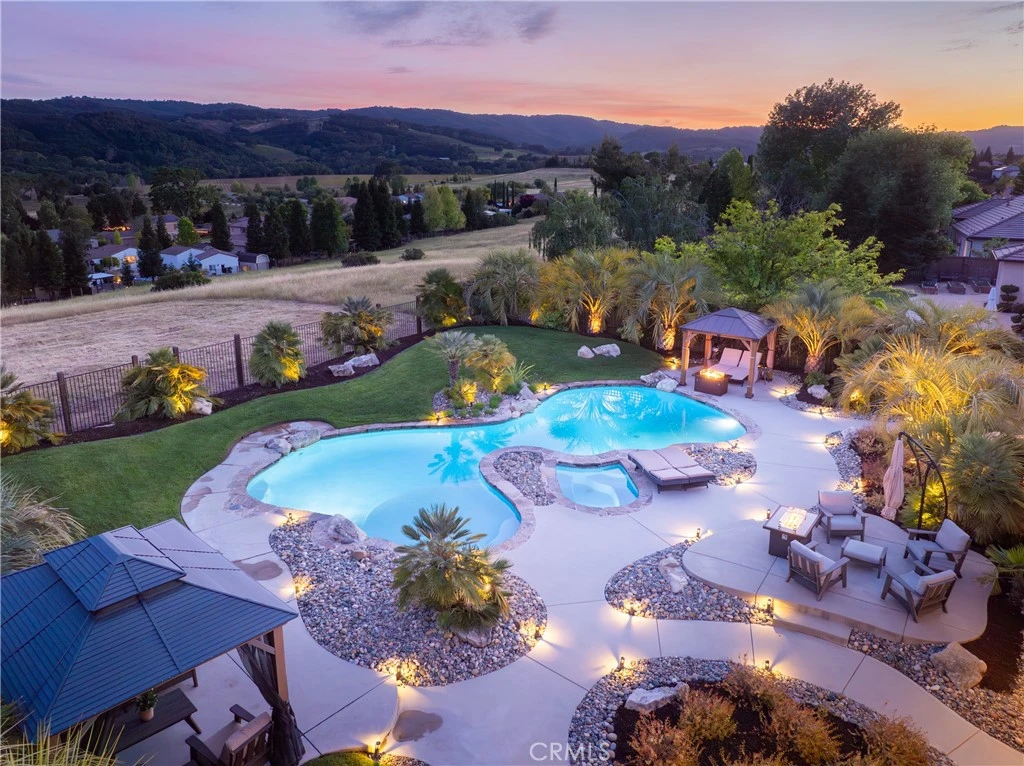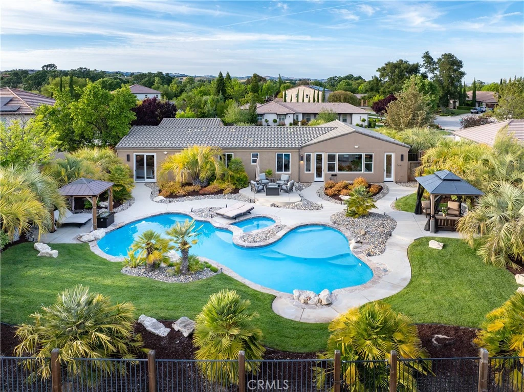 Located in one of Templeton’s most sought-after neighborhoods, The Vineyards, this stunning single-level home offers a resort-style backyard and a tastefully updated interior. Expansive windows look out onto the picture-perfect backyard, framing breathtaking views of Santa Rita ridge. A freeform pool and spa anchor the outdoor space, surrounded by lush landscaping, ambient lighting, and multiple seating areas, including covered gazebos with heaters and misters. Enjoy warm summer days by the pool and cool autumn nights beside sleek fire tables—just imagine stargazing from this luxurious backyard. The open-concept kitchen captures views of the backyard and surrounding hills, flowing effortlessly for both entertaining and everyday living. With nearly new KitchenAid appliances, including a 6-burner stove, any chef will feel right at home. The laundry room includes its own sink, backyard access, and nearly new Speed Queen washer and dryer. A newer HVAC system services the home, while a separate mini-split system conditions the detached garage. The home has been meticulously cared for, with many upgrades completed in recent years. Recently updated engineered bamboo flooring offers rich color and pairs beautifully with the wood shutters. Recessed lighting has been added throughout and can be adjusted to set the mood. The primary suite features a large soaking tub, low-curb shower, and an expansive closet. Don’t miss the private garden area along the side of the home, featuring three cedar greenhouses and double swinging gates for convenient driveway access. This home is designed for both entertaining and everyday enjoyment. Whether you’re watching the game on the 98" TV, hosting a lively pool party, or enjoying an elegant dinner with friends, the layout adapts to your lifestyle. Schedule your tour today. (All patio furniture may be included with an acceptable offer.)