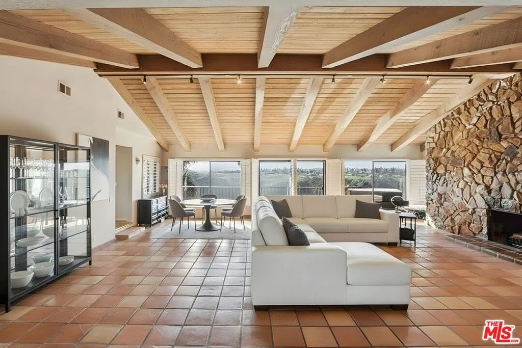 Privately set on an expansive flag lot of over 30,056 sq ft in the exclusive Lynn Ranch of Thousand Oaks, this exceptional view residence offers approximately 4,160 sq ft of living space. A long private driveway leads to a gated courtyard entry, creating a true sense of seclusion and arrival. The home features four bedrooms and four and one-half bathrooms, including three full baths upstairs, a three-quarter bath downstairs, and a separate powder room. Designed to capture breathtaking views from nearly every room, the property showcases three fireplaces, Saltillo terracotta tile flooring, and expansive indoor-outdoor living. A generous balcony spans approximately 65 feet and offers sweeping 270-degree views. The primary suite is ideally positioned on the main living level and includes a spacious bathroom with a dedicated washer and dryer discreetly located behind the closet. An additional washer and dryer hookup is located downstairs. Recent upgrades include a new roof in 2023, new water heater, and newly resurfaced pebble pool in 2023, with pool equipment appearing newer. The property also benefits from leased solar panels installed approximately 15 years ago. A three-car garage complements the property. The downstairs level includes an added kitchen, bathroom, and washer and dryer setup within existing space. An outstanding opportunity for buyers seeking privacy, dramatic views, and a substantial hillside setting.