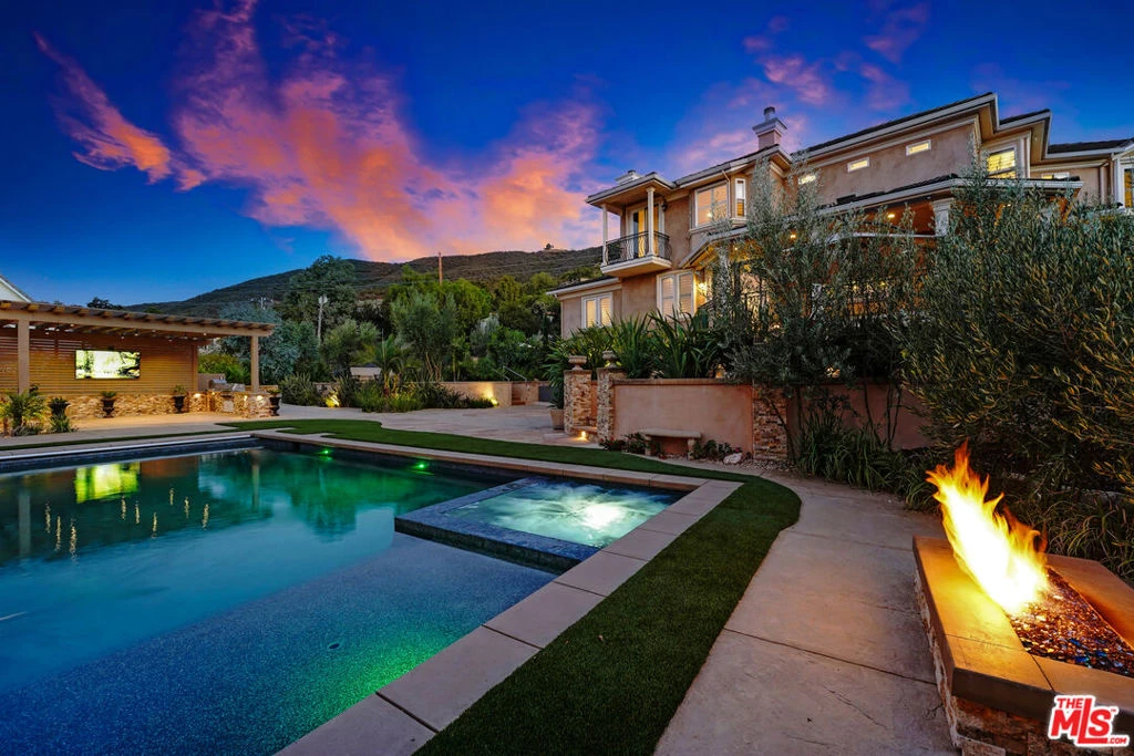 Premier Value! Stunning Mediterranean Hidden Gem! This exquisite custom home with views of Conejo Valley is set on a spacious 29,273 SqFt lot and showcases soaring ceilings and cathedral windows, providing an abundance of natural light through classic shutters. The gourmet chef's kitchen features a center island, granite countertops, stainless steel appliances, and a walk-in pantry, flowing seamlessly into the spacious family room. The luxurious primary suite offers a veranda with views, a bedroom fireplace, his-and-hers walk-in closets, separate his-and-hers toilet rooms, a soaking bathtub, and a glass-enclosed shower. On the lower level, a 530 SqFt mother-in-law studio with a private entrance includes an en-suite bathroom, kitchenette, and stackable washer/dryer. A bonus room above the garage offers large additional storage, accessible from the second floor. Enjoy the convenience of two 2-car attached garages and extra space for more vehicles in the driveway. Additional upgrades include a newer solar system, tankless water heater, dual-zoned AC, and a utility room. Step into a backyard paradise - an entertainer's dream featuring a newer saltwater pool and spa, luxurious outdoor living areas with multiple patios, and a spacious gazebo with a built-in barbecue, pizza oven, fireplace, and television. The meticulously landscaped grounds incorporate drought-tolerant plants, turf, and fruit trees. Market smart, unique and exceptional estate!