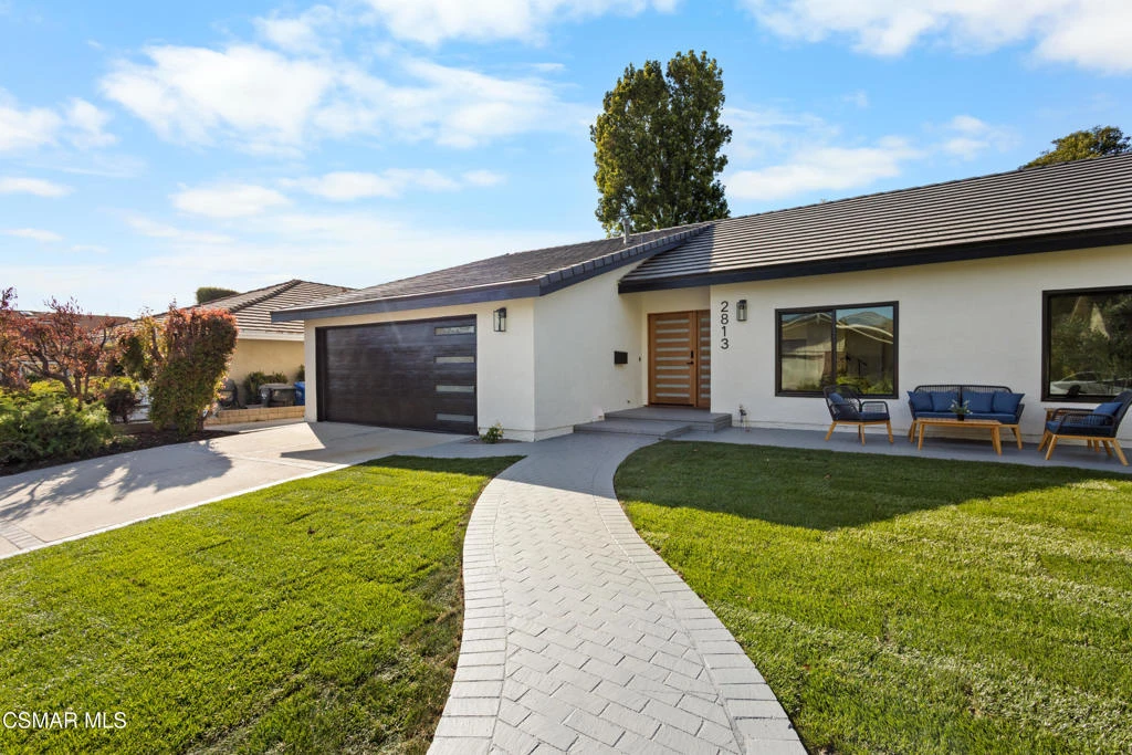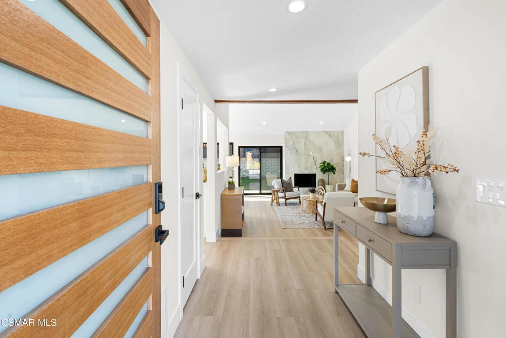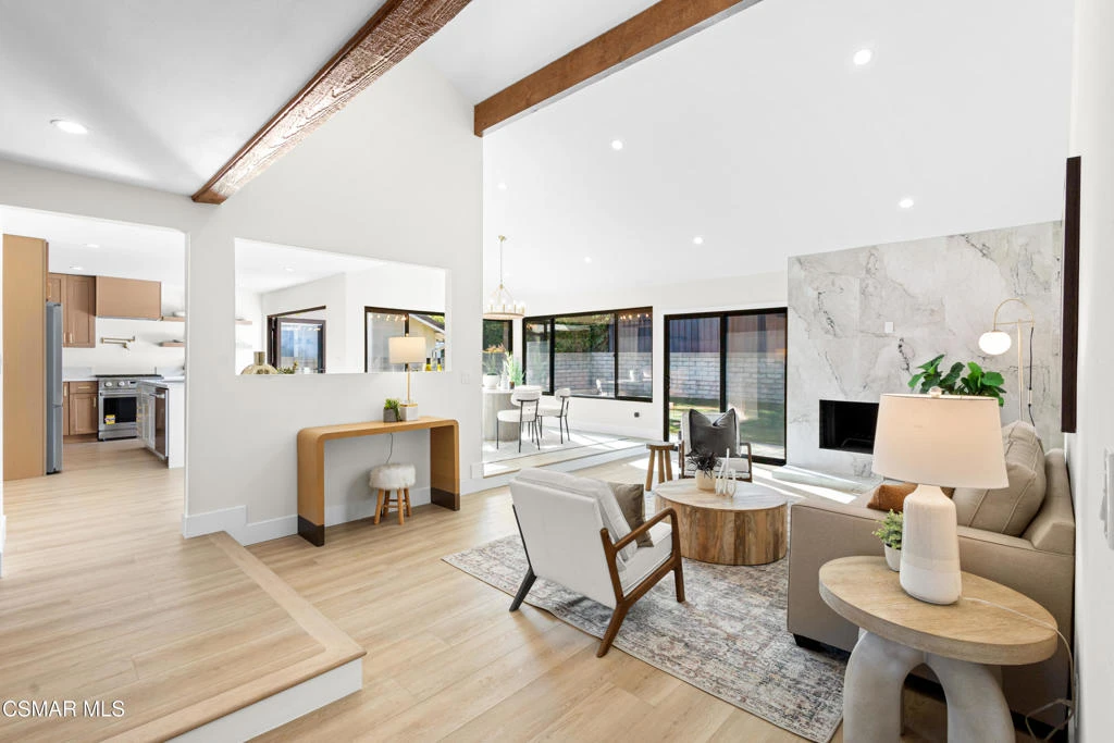 Some homes get updated. This one got reimagined.From the moment you step through the custom wood and glass entry door, the renovation speaks for itself. Brand new roof and tile, new HVAC and ductwork, new electrical panel and sub-panel, new water heater, new black dual pane windows and doors throughout, new large plank flooring, fully remodeled bathrooms, and an EV charger. Every major system replaced or upgraded. Zero deferred maintenance. Nothing to do but move in.What makes this home special is how it lives. The open concept layout flows effortlessly from the entry through the vaulted, beam-lined living room anchored by a stunning floor-to-ceiling tiled fireplace wall and straight out to the backyard through a full accordion glass door off the kitchen. Inside and outside stop feeling like separate spaces. That is the lifestyle this home was built for.The kitchen is the heart of it all. Warm wood and white two-tone cabinetry, quartz countertops, top of the line appliances, and open shelving frame the accordion door that opens directly to the patio and yard. Whether it is a quiet morning coffee or a backyard dinner with friends, this space makes it effortless.Both bathrooms were rebuilt from scratch. The primary bath features a dual sink vanity with wood cabinetry, black hardware throughout, and a glass enclosed shower finished in large format tile. Clean, calm, and spa-inspired.Outside, new hardscape, fresh landscaping, and new perimeter fencing create a private, polished yard that is ready for everything.This is Westlake Village living at its best and it is ready for you right now.
