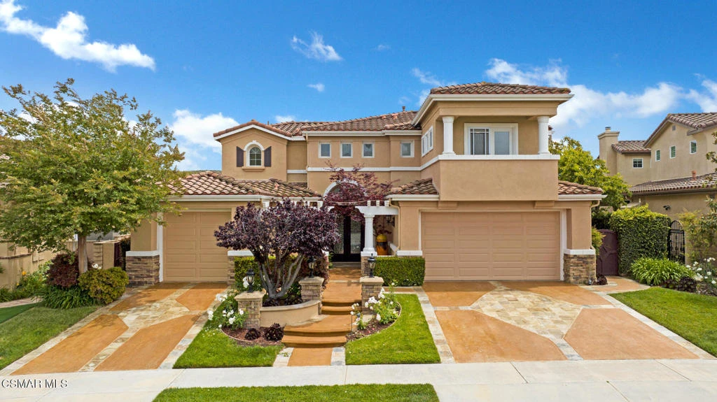 Elegant Mediterranean Estate with Pool, Wine Cellar & Hill Views in GUARD-GATED Woodridge Estates! Welcome to 3188 Eaglewood Avenue--a GRAND 5-bedroom, 4.5-bathroom, 4,100 sq ft estate nestled on a beautifully manicured 7,963 sq ft lot in the prestigious GUARD-GATED enclave of Woodridge Estates in Thousand Oaks! Built in 2003 and designed with sophistication, privacy, and entertaining in mind, this Mediterranean-style retreat blends luxurious finishes, flexible spaces, and serene outdoor living--backed by hillside views and minutes from top-tier amenities and open space trails. From the moment you arrive, the home makes a STUNNING first impression. Stacked-stone surfaced pillars, stamped concrete walkways, and lush green lawns frame the elegant facade. Step inside through the custom double entry doors--appointed with wrought iron detail & rain glass accents--into a DRAMATIC two-story foyer with mosaic tile inlay and a soaring chandelier that sets the tone for this stately residence. Just off the entry, the formal Living Room provides an elegant space to welcome guests, featuring a gas fireplace and views of the home's tranquil courtyard. This serene outdoor lounge includes a beautiful patio cover & stamped concrete floor, ready for outdoor dining/entertaining. The Family Room offers a cozy-yet-open media space with rustic stone fireplace, floating mantle, built-in media cabinetry, and backyard views. Open to the GOURMET Chef's Kitchen, it forms the heart of the home--perfect for hosting and gathering. The Kitchen dazzles with a large granite-topped center island with breakfast bar seating, extensive custom cabinetry, built-in Sub-Zero refrigerator, Viking Professional 6-burner gas range + double convection ovens, and a step-in pantry. A nearby Butler's Pantry with beverage fridge and granite-topped cabinetry leads into the formal Dining Room--finished with wood-like flooring, wainscoting, and lush backyard views. A charming Wine Cellar with arched wrought iron door and built-in racks rounds out the main entertaining level. The versatile floorplan offers a true downstairs guest suite featuring a bedroom with Murphy bed, built-ins, plus an en-suite 3/4 bathroom with granite vanity and tiled shower. Upstairs, a large open Loft/Bonus Room functions beautifully as a gym, media room, playroom, or study--complete with built-in desk. The spacious upstairs Primary Suite enjoys its own private wing, with sitting area, tray ceilings, views of local hills via tall windows, a long closet, and a LUXURIOUS en-suite bathroom showcasing dual stone-topped vanities, a central makeup station, jetted soaking tub, tile shower, and TWO custom walk-in closets. Three additional upstairs bedrooms offer flexible configurations--two with walk-in closets and one with French doors to a private balcony with hills views. Two additional full bathrooms (including one en-suite) complete the upper level. The backyard is a PRIVATE retreat designed for both relaxation and recreation. Enjoy a sparkling PEBBLE-surfaced pool and spa, stamped concrete patios, built-in wood-burning fireplace, and a romantic wood deck with ORIENTAL GAZEBO. Lush plantings include mature trees, flowering vines, a fig tree, rose bushes, and vibrant grass lawns--all backdropped by serene hills. Other highlights include a dual-zone HVAC system, MILGARD dual-pane windows, AquaLink pool equipment, tall crown/base moldings throughout, and finished garages (2-car + single-car) which are directly accessible. Situated near acclaimed Conejo Valley schools, this home also enjoys close access to fantastic hiking trails in Wildwood Park & Lang Ranch, shopping centers, fine dining, and the 101/23 freeways for easy commuting. This is luxury Thousand Oaks living at its finest--gated, private, and packed with amenities!