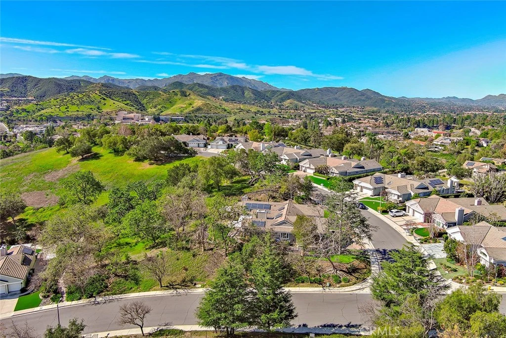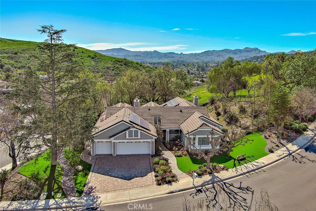 This gorgeous, highly sought after, ranch home embodies what Thousand Oaks living is all about. Upon entering, the peaceful backdrop of tree lined rolling hills greets you immediately. There is no escaping the beauty of nature from any room in this home. The many updated windows in every living area provide endless views of mature trees and greenery. The high ceilings allow for tons of natural light and add to the feeling of being transported into the countryside. With over 3200 sq ft, this single-story home offers four bedrooms and 4 bathrooms. The layout is ideal with the primary located on one side of the home and the other three rooms on the other. One bedroom is currently being used as an office with solid built-in desks providing functionality. Designed with a seamless flow for daily living, the floorplan offers a renovated kitchen with an eating area that opens to the family room and directly to the outdoor area which is professionally landscaped and equipped with tasteful pavers, a built-in BBQ, and covered patios. There is also a formal dining room, living room, and bar area, which all overlook the outdoor scenery and lend the home to effortless entertaining. The primary bedroom is a true escape designed with detail in mind. The large room has a picture window view of the backyard, the closet has been enlarged and custom fitted for optimal storage and function, and the jetted tub and double sink with a vanity built in offer spa-like luxury. The large laundry room leads to the 3-car garage. One bay has been remodeled with added storage and a large tool bench. On the other side of the home, you will find three other bedrooms. One of those secondary bedrooms has a large en-suite bath which could be a great option for guests, in-laws, or children. This home offers all renovated bathrooms, ample cabinets throughout the home, custom shutters, leased solar that keeps electrical bills very low, a security system in place, surround sound in the family room, wiring for an EV charger, and 3 Ring cameras. The real star of the show is the yard and the views from it. Perched on the hill, the view goes on for miles, nature is all around you, and you cannot miss the sheer calm that this home provides. The HOA includes a basketball/sport court, a tennis court and walking trails. You do not want to miss it!!