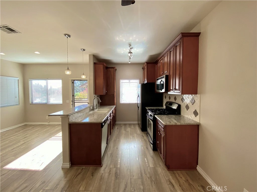 Stunning condo completely remodeled from top to bottom! 3 bedrooms, 2.5 bathrooms with an open floorplan. Great end unit with fantastic views & incredible, natural lighting. This property features upgrades galore: engineered wood flooring, neutral paint, gourmet kitchen with custom cabinetry, granite counter tops, stainless steel appliances, including brand new refrigerator, gorgeous tile backsplash, upgraded sink & breakfast bar. The list of upgrades is endless: custom lighting throughout, upgraded baseboards, some newer windows, smooth ceilings, raised panel doors, upgraded hardware, mirrored closet doors, brand new washer & dryer & much more! All three bathrooms have been beautifully remodeled with custom cabinetry, tile flooring, granite counters, upgraded lighting & custom tile surround in the bathtub and shower. Wonderful oversized deck, ideal for enjoying sunsets and summer BBQs! One large carport with an additional storage and one reserved parking spot. Wonderful community in the heart of Thousand Oaks, close to shopping, dining and easy freeway access.