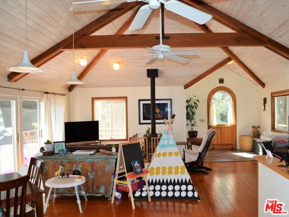 Discover your dream retreat in this delightful chalet featuring 2 cozy bedrooms and a full bath. The soaring vaulted ceilings and expansive windows create a light-filled ambiance, perfect for relaxation. Enjoy the warmth of the wood-burning fireplace while admiring the beautiful hardwood floors throughout. Step outside to the wrap-around deck, ideal for enjoying the serene surroundings. The common area yard adds extra charm, making it a sweet spot for gatherings. Located just minutes from The Living Cafe, Cafe 27, and the heart of town, as well as beautiful beaches and easy access to SFV and Santa Monica, this chalet is a special home waiting for you!