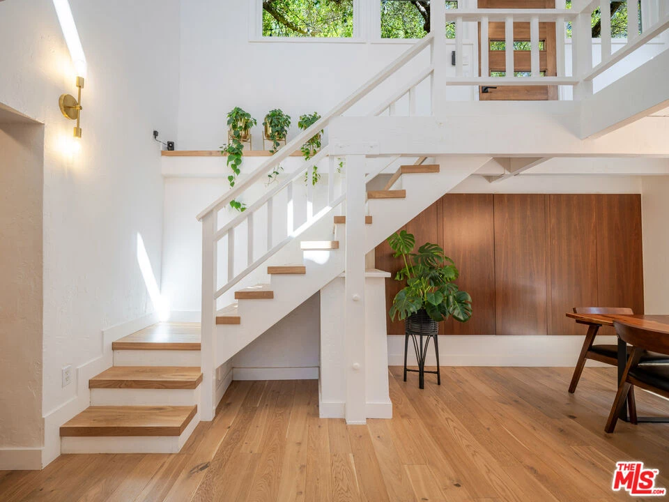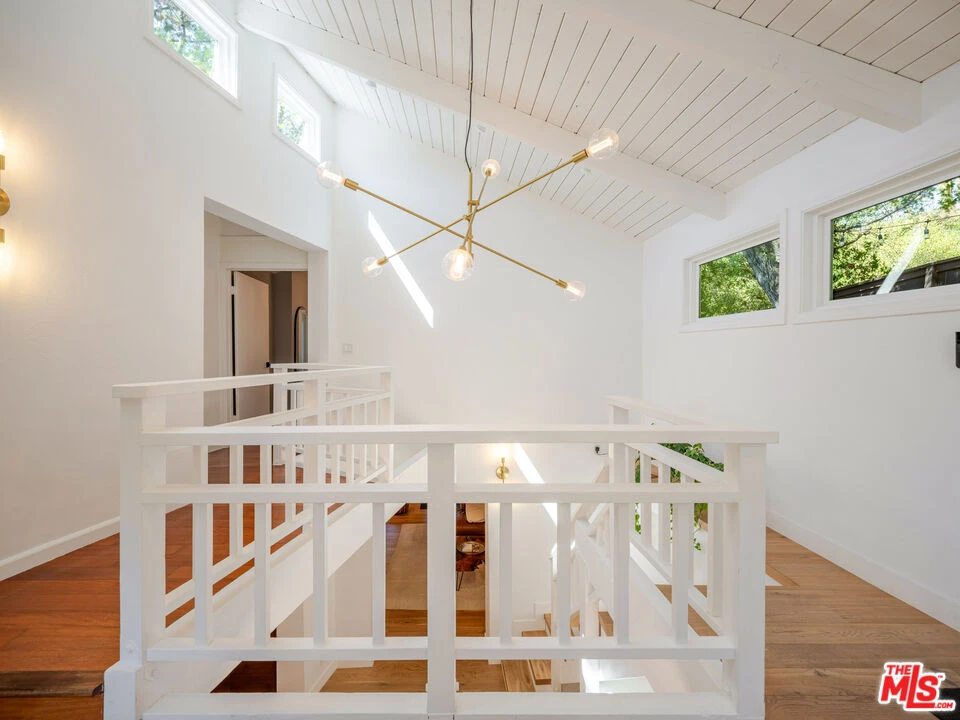 Welcome to the ultimate Topanga retreat, where modern upgrades meet timeless canyon charm. Nestled on a quiet, hidden street off Topanga Canyon Blvd, this treasure offers the perfect balance of privacy, style, and connection to nature. Inside, an open entry concept features soaring vaulted ceilings extending both levels and a modern chandelier welcoming bright natural light. Upstairs, the space leads to two bedrooms, and a crisp, updated bathroom with a classic clawfoot tub. The spacious primary suite features a comfortable additional space to relax or work, and opens to its own private deck, the perfect spot to enjoy your morning coffee while taking in tree-lined canyon views. The large deck wraps around for great outdoor entertaining under delightful string lighting. The main floor effortlessly blends contemporary design with Topanga character. The recently remodeled kitchen boasts continuous-grain walnut cabinetry, white quartz countertops, high-end built-in appliances, and a generous island with waterfall, ideal for cooking and entertaining. Large double doors open to a beautifully landscaped fully-fenced flat backyard, inviting a harmonious indoor-outdoor flow. The dining area is framed by walnut finishes perfect for gatherings, while the cozy living room invites movie or game nights. A third bedroom with a remodeled en-suite bathroom adds comfort and flexibility. The extensive list of upgrades includes beautiful oak wood flooring, new windows and doors throughout, and a whole-house water filtration system. Step through the living room to discover a bonus entertainment room and direct access to the driveway, complete with automatic gate and EV charger. In the vicinity you'll find central access to the best of the westside and the valley communities. Featuring scenic drives to nearby beaches, Santa Monica, Malibu and Calabasas. Enjoy local gems including the Topanga Community Center, playground and ballfield, weekly farmers market, Food Truck Fridays, and charming coffee shops and cafes, combining peaceful canyon living with vibrant neighborhood amenities.