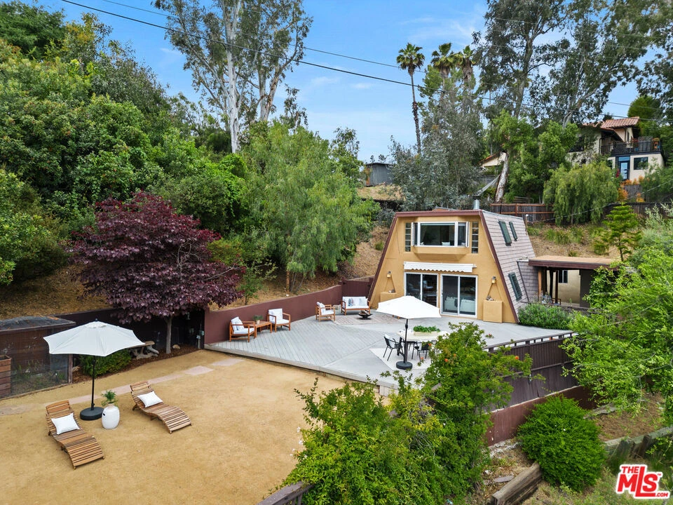 Up a paved driveway, nestled within the serene landscapes of Old Topanga lies a magical property offering a heaven of sanctuary. A pond with cascading waterfall and greenery greets you as you enter from the wraparound deck that surrounds the home. The living room is a warm and welcoming space bathed in natural light, with hardwood floors and stone fireplace that creates a cozy atmosphere. The adjacent dining area is open to the stylish cooks kitchen featuring custom walnut cabinetry, stainless steel appliances, quartz countertops and a breakfast bar. Sliding doors lead out to the expansive Trex deck - an ideal setting for al fresco dining and entertaining with multiple spaces to relax and restore. An extended outdoor area lies beyond that - complete with an enclosed veggie garden/chicken coop and room for a play structure and spa. The yard, with its serene canyon views, is a low maintenance, colorful and drought tolerant dream and the easy indoor/outdoor flow makes for Topanga living at its finest. Completing the first level is an additional room with an en-suite bathroom featuring slate tile that can be used as the third bedroom or a den. Upstairs awaits your primary bedroom bathed in natural light, with a huge skylight and large bay windows looking out to the Topanga skyline giving a treehouse-like ambiance. The upper bathroom's wood and slate materials exude a rustic elegance. The upper level has an additional bedroom and a laundry nook. New mini-splits around the home ensure that you will stay cool during the summer months. The detached 2 car garage and separate storage shed add functionality to this impressive residence. The property encompasses 3 separate parcels on a nearly half acre lot. Don't miss this opportunity to immerse yourself in the Topanga lifestyle.