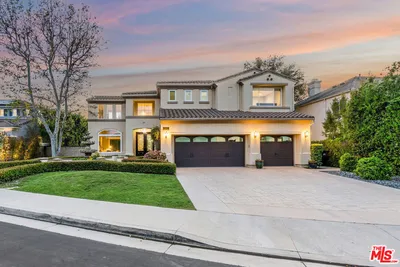 Guard-gated canyon estate with panoramic mountain and Catalina views, just minutes to Malibu beaches and Calabasas shopping and dining. Set high above the valley in Summit Pointe, this private home blends dramatic scale with peaceful canyon living. Double-height living and dining spaces frame sweeping vistas and open to a resort-style backyard with saltwater pool and spa, outdoor fireplace, built-in BBQ, covered patio, mature trees, and refreshed landscaping, ideal for entertaining or quiet retreat. Folding glass doors create seamless indoor-outdoor living. The open-concept kitchen with large center island flows into the main living areas, perfect for gatherings. The main level includes a guest suite with ensuite bath and two flex rooms ideal for a home office, gym, media room, or studio, plus powder room, laundry, and multi-car garage. Upstairs, the primary suite spans the rear of the home with a private balcony overlooking the mountains, spa-style bath, dual walk-in closets, and separate office or wellness area. Three additional bedrooms each feature private baths, including one with a steam shower. Smart home technology, EV charging, surround sound, patio heaters, and new HVAC provide modern comfort. Nearby premier equestrian facilities, including Fair Hills Farms, and easy access to Malibu beaches, canyon trails, golf, and the Calabasas-Malibu scene come together here in a way that is hard to find elsewhere.