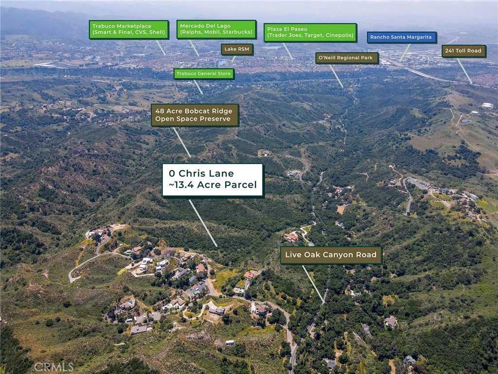 Located just off picturesque Live Oak Canyon Road in Trabuco Canyon, this parcel is 13.4 acres of precious raw, rural land in Orange County - a truly rare commodity. Build an equestrian dream home overlooking the rural canyon, use it for conservation or mitigation banking purposes or - keep it as is and preserve it for future generations. This property has rolling hillsides, oak canyons, and views that stretch for miles, all located within a short drive to Rancho Santa Margarita & Mission Viejo. Get the best of both worlds - rugged and raw living only minutes from shopping, dining, grocery stores, great schools, and hiking & biking trails. The 241 toll road is less than 10 minutes away - get away to the beach or business centers of Irvine & Newport Beach in 20 - 30 minutes. The property is subject to the "Foothill/Trabuco Specific Plan" (FTSP) which was crafted to preserve the character of the canyons; the FTSP limits the uses of the property but ensures that the canyon areas will be developed responsibly and stay beautiful for generations to come. Development of three (3) dwelling units is possible per the FTSP, subject to satisfying development requirements of the FTSP & County of Orange.
