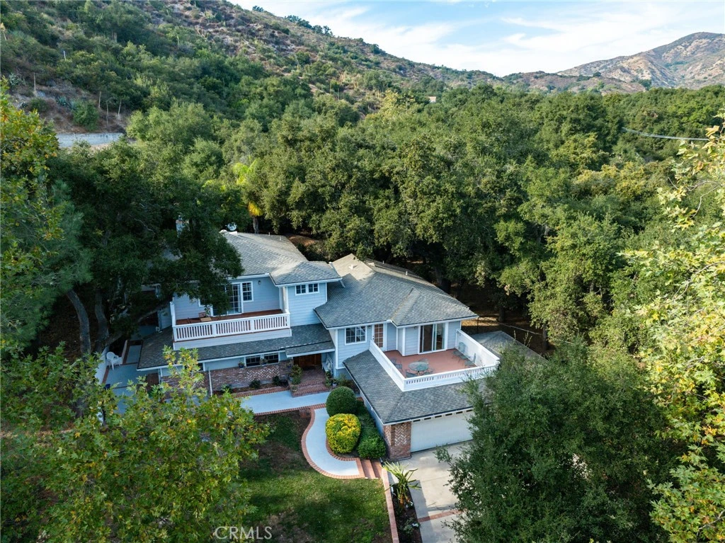 This custom home truly has it all—from the oversized garages for the car or boat aficionado to multiple outdoor options perfect for entertaining, and a versatile layout ideal for multi-generational living with kitchenette. The expansive finished 4.5-car garage offers abundant room for vehicles, ATVs, boats recreational equipment, or weekend projects. The home features a private wing designed for multi-generational living with 2 bedrooms and an optional third bedroom or a kitchenette area with a sink, refrigerator, washer, dryer, hot plate, and two bathrooms—providing privacy and convenience for family or guests. The multiple decks and patios are perfect for enjoying your morning coffee or sipping a beverage while watching the sunset under the oaks. Inside, the open-concept design welcomes you with a spacious great room featuring a raised hearth brick fireplace, a kitchen with a breakfast bar, and a dining area perfect for gatherings. Upstairs, a custom wood staircase leads to the main primary suite and adjacent office/den, highlighted by soaring 10-foot ceilings, a double-sided fireplace, and a private balcony with gorgeous views. The primary suite includes an oversized walk-in closet with sewing/craft room and a luxurious bath with a glass-enclosed shower, dual sinks, and stone countertops. Additional highlights include dual-pane windows, forced air heating and air conditioning, custom crown molding, and a separate laundry room. The beautifully hardscaped, enclosed patios provides ideal space for outdoor entertaining. Located just minutes from shopping, fine dining, cinema, Cooks Corner, O’Neill Regional Park, and the 241 Toll Road, this home offers quick access to shopping, dining, schools, and endless miles of hiking, biking, and horse trails