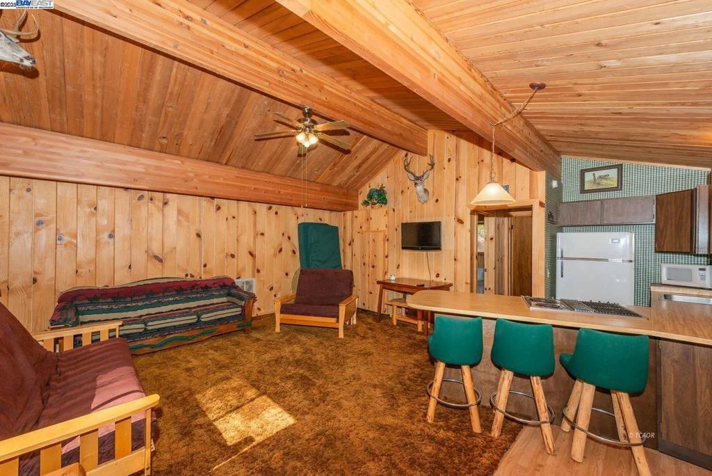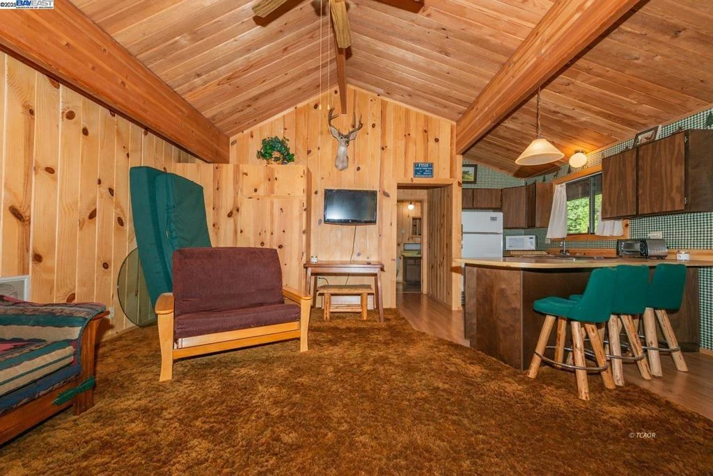 Nestled at the foot of the stunning Trinity Alps Wilderness, this charming 980 sq. ft. cabin captures the essence of mountain living and lakeside relaxation. Featuring beautiful T & G hemlock wood and vaulted ceilings, this inviting retreat offers a warm, rustic atmosphere throughout. The main level features a cozy one-bedroom, one-bath layout, with the kitchen conveniently centered in the heart of the home-perfect for easy gatherings, great natural light that enhances the cabin's serene charm. Downstairs, a walkout basement provides additional sleeping space with two large beds, ideal for guests or family getaways. Step outside to enjoy the expansive wraparound deck-perfect for relaxing, entertaining, or taking in the forested scenery. Built with quality in mind, the cabin features redwood board-and-batten siding, a durable metal roof, and ample decking. Sitting on .43 of an acre, there's plenty of room for boat or RV parking-and with Trinity Lake right across the street, your next adventure is always within reach! Whether you love boating, fishing, backpacking, hiking, or camping this property is your gateway to the great outdoors. Enjoy peace, privacy & endless recreation.