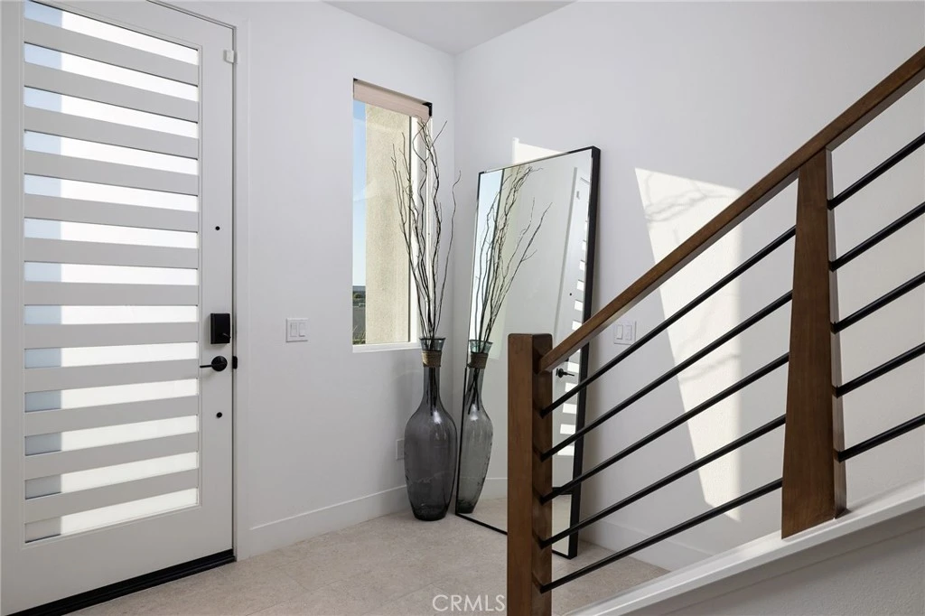 This newly built luxury townhome in The Landing at Tustin Legacy offers the perfect blend of modern sophistication and everyday convenience in one of Orange County's most desirable new communities. Completed in 2023, this light-filled contemporary home welcomes you with an open-concept layout featuring soaring 12-foot ceilings, imported Italian stone floors, and sleek matte black designer finishes that create an atmosphere of understated elegance. Enter the 3-story plan through the thoughtfully designed lower level that includes an ensuite bedroom (or optional office or fitness room) and direct access to the two-car garage. This space also opens directly to a sunny patio, bringing the outdoors in and making for a welcoming curb appeal. Large windows fill the second-level great room with natural light, creating an ideal environment for both entertaining guests and everyday relaxation. The living room flows seamlessly to a private balcony, extending your living area outdoors. The luxe chef's kitchen is finished with full-height maple cabinetry, a complete stainless steel JennAir/KitchenAid appliance suite, and a striking quartz island ready for casual bites and conversation. Upstairs, two generously sized bedrooms each provide ample accommodation with large windows and spacious closets. The primary suite serves as a true retreat, with two walk-in closets featuring professional organizers and a spa-like bathroom with double sink vanity and oversized shower. Modern convenience is built-in, with smart features including paid solar panels, an EV charger, Google Home smart system, instant hot water system, and SpringWell whole-home water filtration system. This property’s excellent location within The Landing community provides views of Disneyland fireworks displays and John Wayne Airport, while being within the boundaries of top-rated Tustin Unified schools. All within walking distance of The District shopping center and entertainment, local parks, and a diverse array of restaurants, creating a lifestyle where luxury living meets unmatched convenience in the exciting heart of Tustin Legacy.