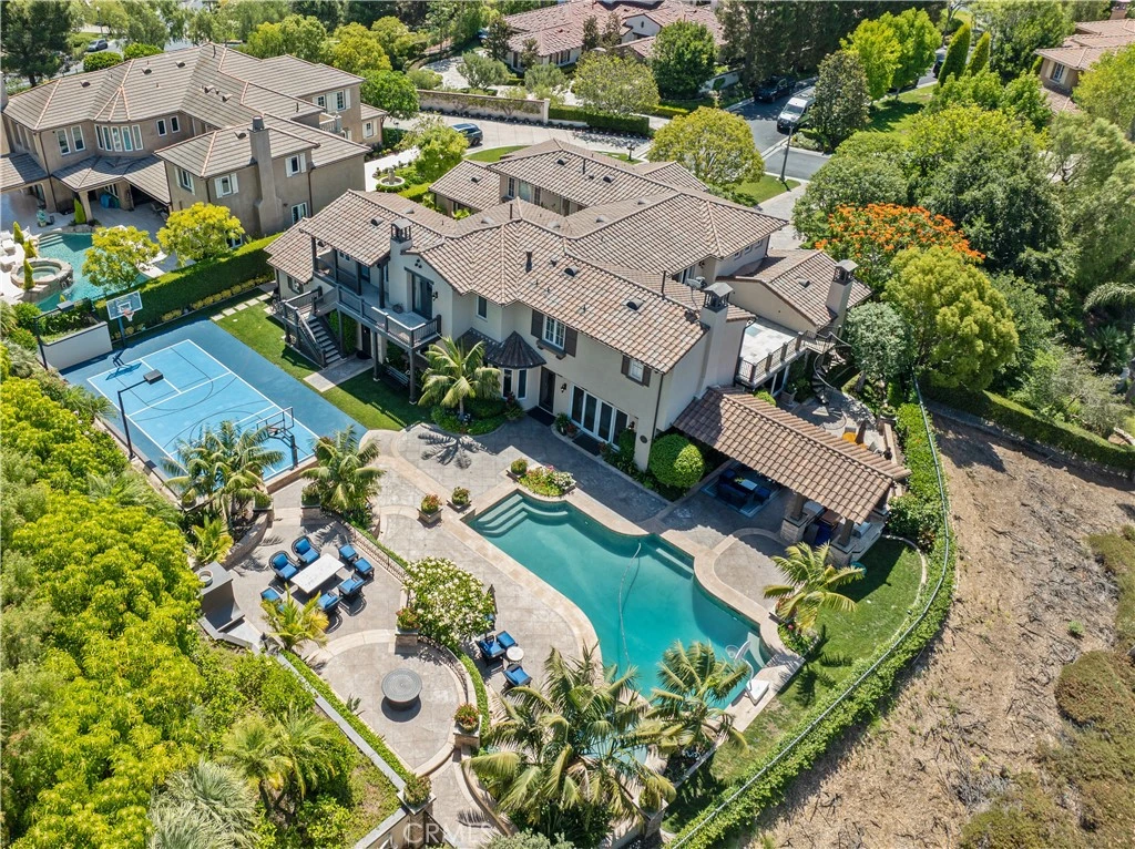 Incredible opportunity to own a show-stopping estate in the prestigious, guard-gated Tustin Ranch Estates! This home sits on a massive 24,829 sq ft corner lot at the end of a quiet cul-de-sac and offers over 5,600 sq ft of beautifully designed living space. Inside, you'll find 5 spacious bedrooms, 6 baths, formal living and dining rooms, a great room, separate family room, executive office, gym, private entrance guest casita, and more. The kitchen has been opened up and refreshed with matte-finish black stone countertops, freshly painted cabinetry, and top-tier appliances including a 6-burner range, double ovens, and built-in refrigerator. Throughout the home you’ll find new lighting, ceiling fans, and freshly painted walls. Additional upgrades include cleaned and sealed stone floors, new wood gates, resurfaced sport court, repainted exterior stucco, and a five-camera Ring security system. The primary suite is a dream, featuring a cozy fireplace, spa-like bath with soaking tub and walk-in shower, a huge walk-in closet, and personal balcony. Step outside to your private resort: pool and spa, multiple patios, outdoor fireplace, built-in BBQ, cabana, and basketball court! Gated 3-car garage, motor court driveway, and lush, manicured landscaping complete this incredible property. Homes like this rarely hit the market, you don’t want to miss it!