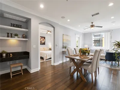 Rarely available and move-in ready, this former model corner residence in Valencia’s sought-after Five Point community offers EV Charging and Solar. Ideally positioned in a private end location, this light-filled home features an open-concept layout that seamlessly connects the main living area to a set-back balcony giving you a more private and quieter feeling. Thoughtfully upgraded with designer finishes, the interior showcases custom paint with accent detailing, stylish lighting, plantation shutters with split-tilt functionality, plush new carpeting with premium padding, LVP flooring, and sleek cabinetry with soft-close features. The spacious layout lives larger than many three-bedroom homes, offering oversized closets and abundant storage. As a former model, the home includes smart-home technology, a private tandem garage with EV charger, custom garage shelving, whole-home water filtration system, and additional nearby private storage. Located within Valencia by Five Points’ eco-conscious community designed for net-zero greenhouse gas emissions, residents enjoy EV-friendly infrastructure, community gardens, and expansive green spaces, weekly farmers markets, resort-style pools with cabanas, gas barbecues, children’s play areas, multiple parks, scenic walking and golf cart trails, and breathtaking mountain views throughout the community—all with more favorable HOA dues than many newer communities. Just minutes from the 5 Freeway, Highway 126, Six Flags Magic Mountain, and all that Valencia has to offer. This home is a must see!!!