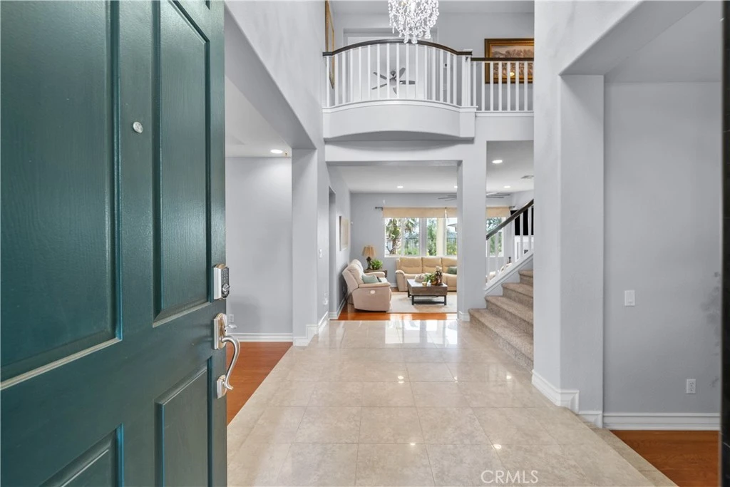 Welcome to this beautifully updated Huntington Collection home located in the highly sought-after Tesoro del Valle community. From the moment you arrive, you’ll be captivated by the attractive curb appeal, lush landscaping, inviting front porch with sitting area, and grand double-door entry. Step inside to nearly 3,500 sq. ft. of thoughtfully designed living space, offering 5 bedrooms (including one conveniently located downstairs), 3 bathrooms, formal living and dining rooms, a spacious great room, laundry room, and a 3-car garage. Cathedral ceilings in the entry create an impressive first impression, while abundant windows flood the home with natural light. The heart of the home is the beautifully updated kitchen, featuring premium Thermador appliances, including a Wi-Fi-enabled oven, a microwave-convection oven combination, and sleek finishes throughout. This expansive kitchen offers generous cabinetry, ample counter space, a large island, coffee bar, and a massive walk-in pantry—perfect for both everyday living and entertaining. All bathrooms have been tastefully upgraded, offering a fresh, modern feel with designer finishes. The spacious primary suite is a true retreat, showcasing double-door entry, a private sitting area, romantic balcony with city-light views, and a large walk-in closet. The spa-inspired ensuite bath features dual sinks, a soaking tub, separate shower, and abundant linen storage. Secondary bedrooms are generously sized with ample closet space, while the downstairs bedroom and adjacent bath are ideal for guests or multi-generational living. Step outside to a private entertainer’s backyard complete with a large, covered patio, beautiful landscaping, and multiple spaces for outdoor dining and relaxation. Enjoy the lifestyle Tesoro del Valle is known for—close to parks, award-winning schools, shopping, and convenient freeway access. This move-in-ready home seamlessly blends timeless elegance with modern upgrades and is truly one you won’t want to miss.